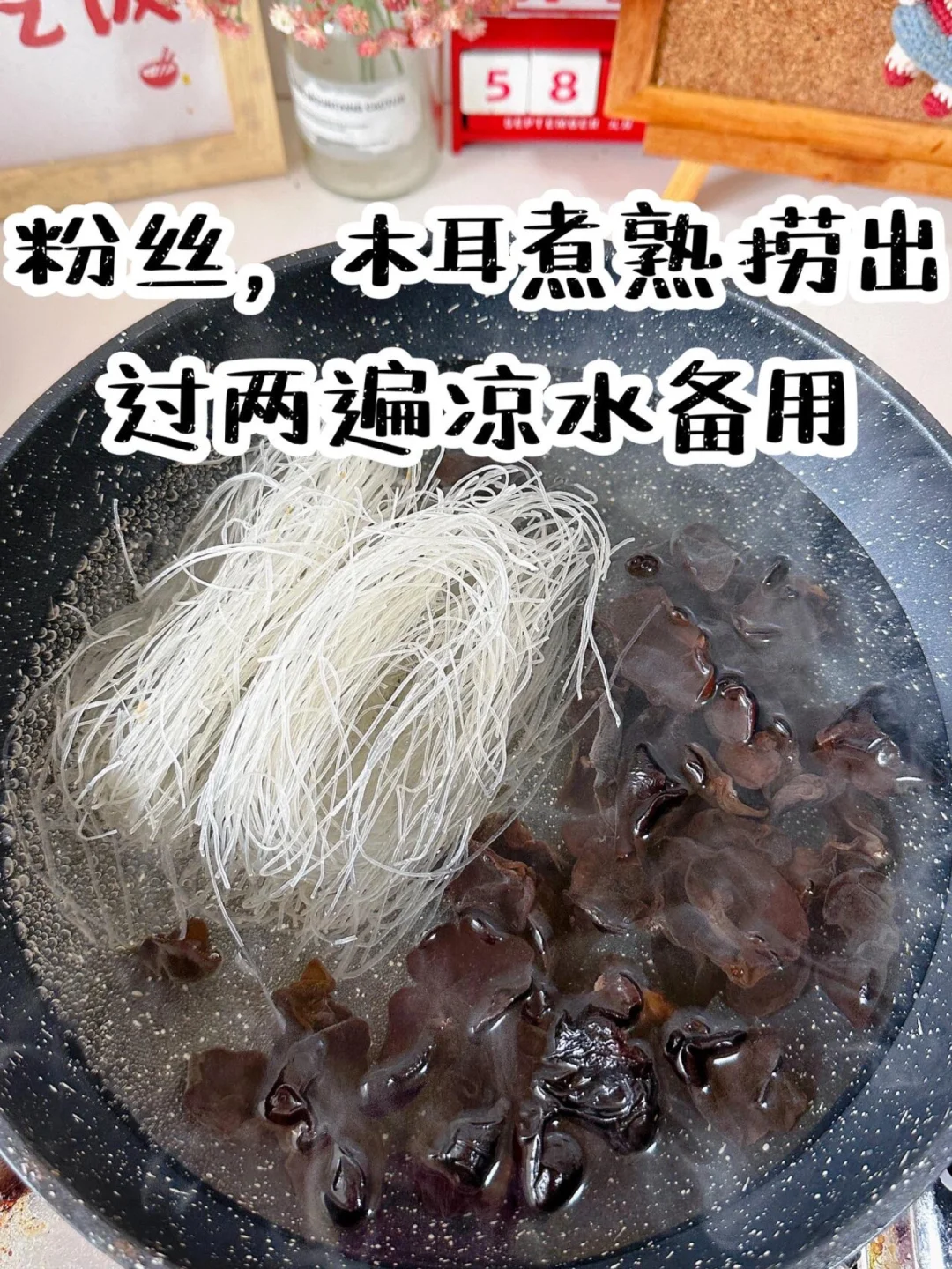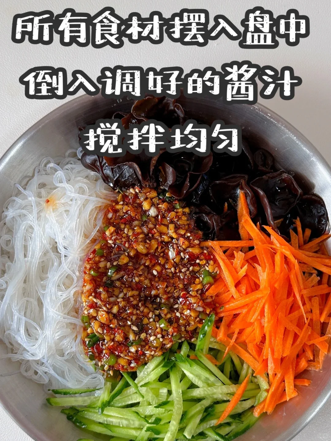 [购物车R][购物车R][购物车R][购物车R][购物车R][购物车R] 准备食材:粉丝,胡萝卜🥕,黄瓜🥒,木耳 1⃣️木耳和粉丝煮熟捞出,过两遍凉水备用 2⃣️酱汁,蒜末,葱花,白芝麻,辣椒粉,淋一勺热油,加入两勺生抽,再加入一勺蚝油,一勺香醋,一勺白糖,搅拌均匀备用 3⃣️胡萝卜黄瓜切丝,所有配菜放入盘中,倒入调好的酱汁搅拌均匀就完成了✅