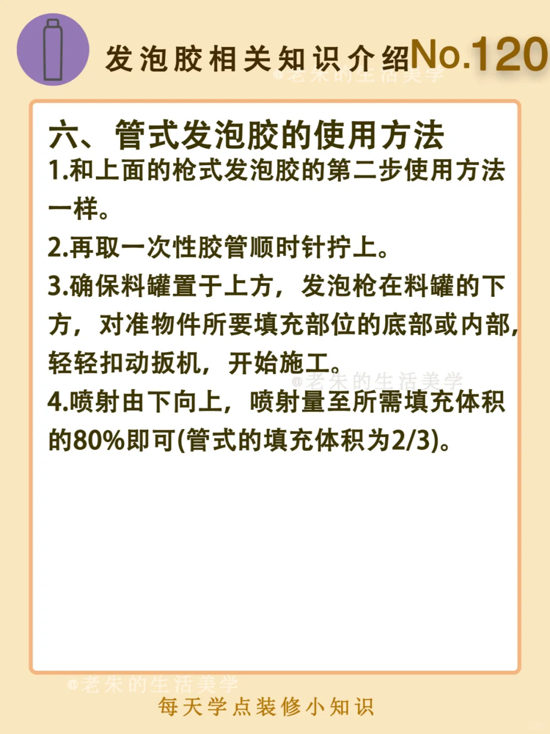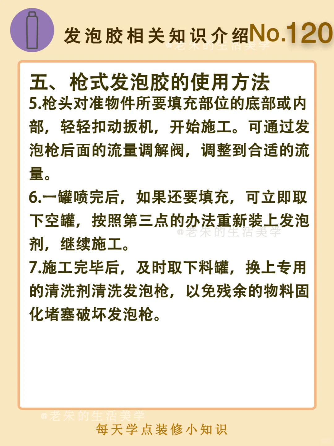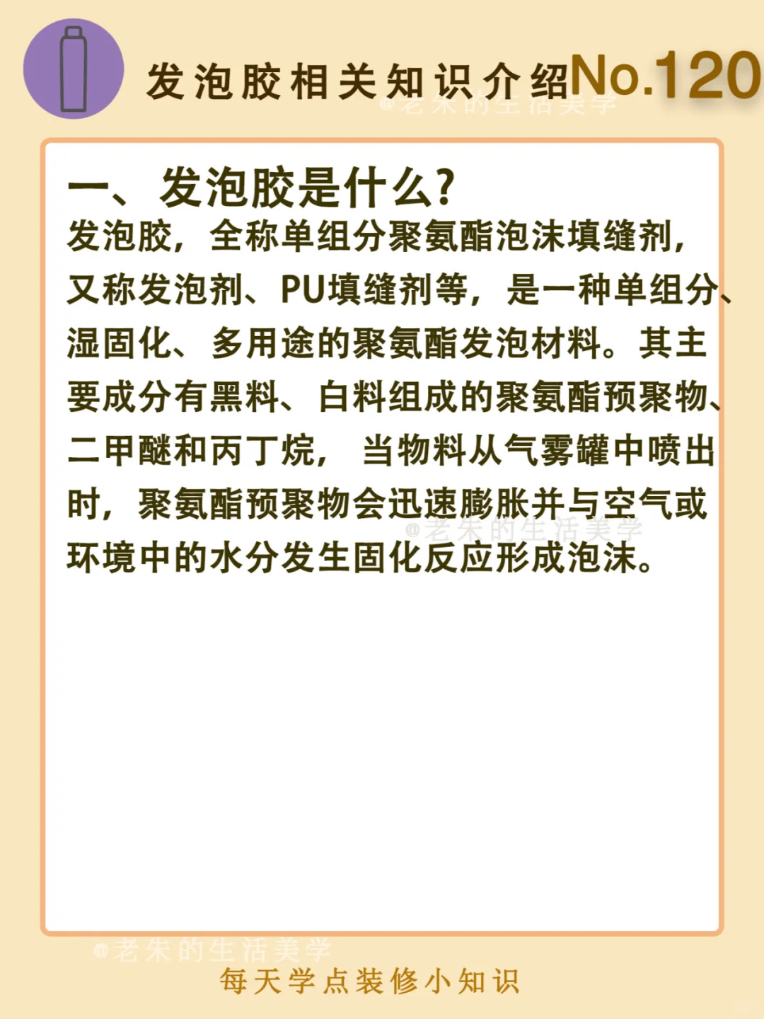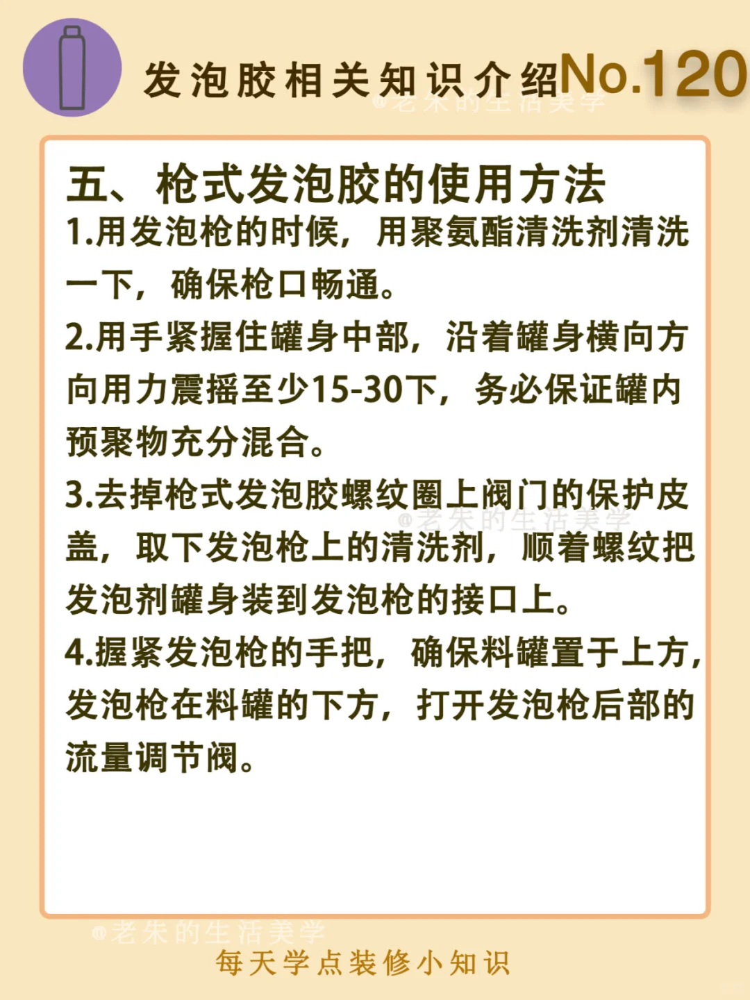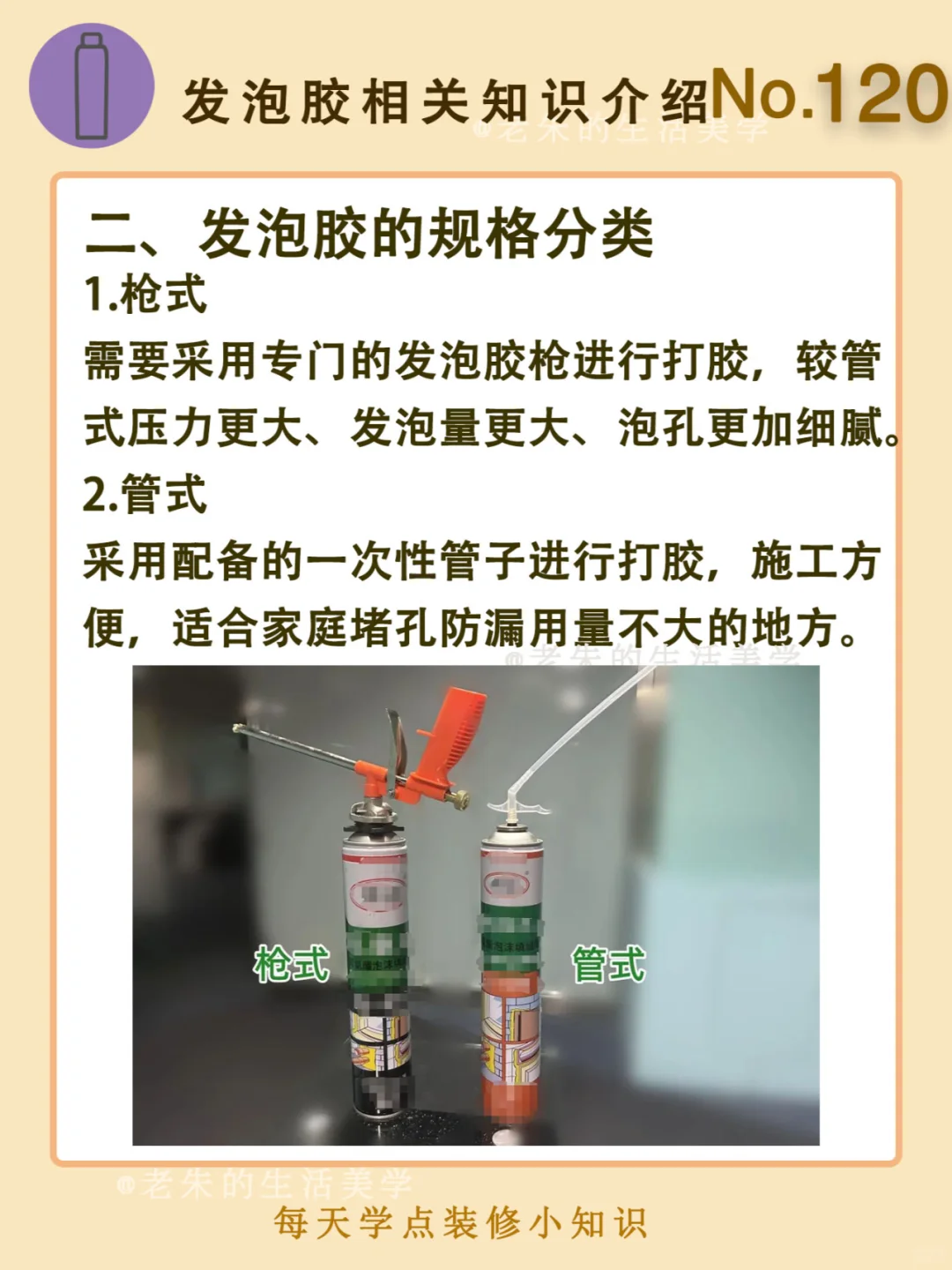 🔆 一、发泡胶是什么 二、发泡胶的规格分类 三、发泡胶的优点 四、发泡胶的用途 五、枪式发泡胶的使用方法 六、管式发泡胶的使用方法 七、注意事项 🔆 我是老朱 📍坐标天津 前上市公司金牌工长🏅 30年施工经验🛠 承接天津新房装修/老房改造 精心整理关于设计&施工&装修的攻略📝 关注我每日更新🗓 也可以在评论区留下您宝贵的想法与建议💓 让您装修不走弯路✅