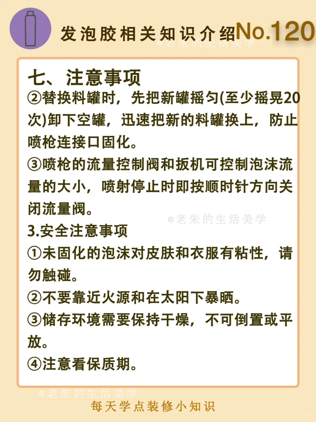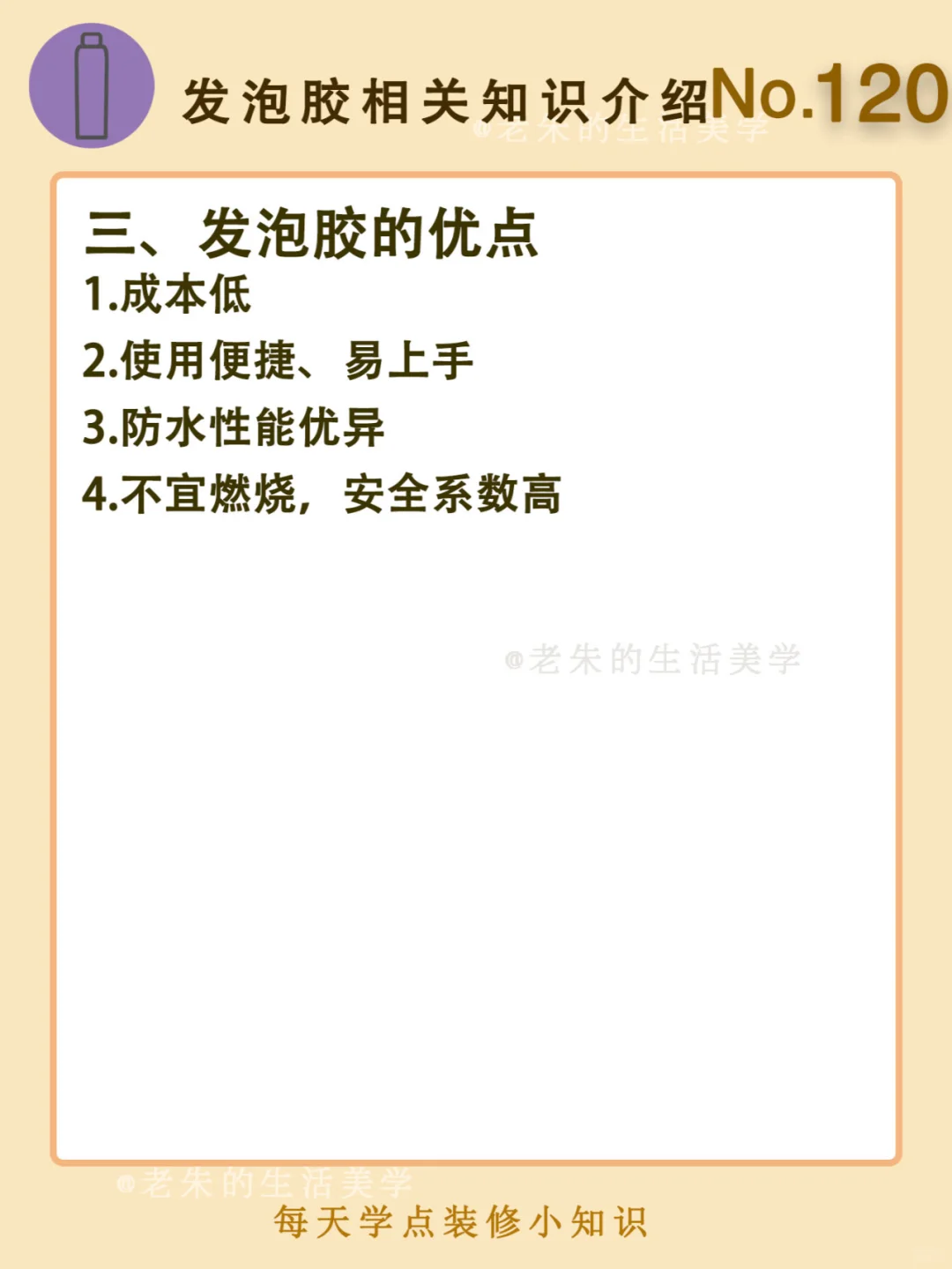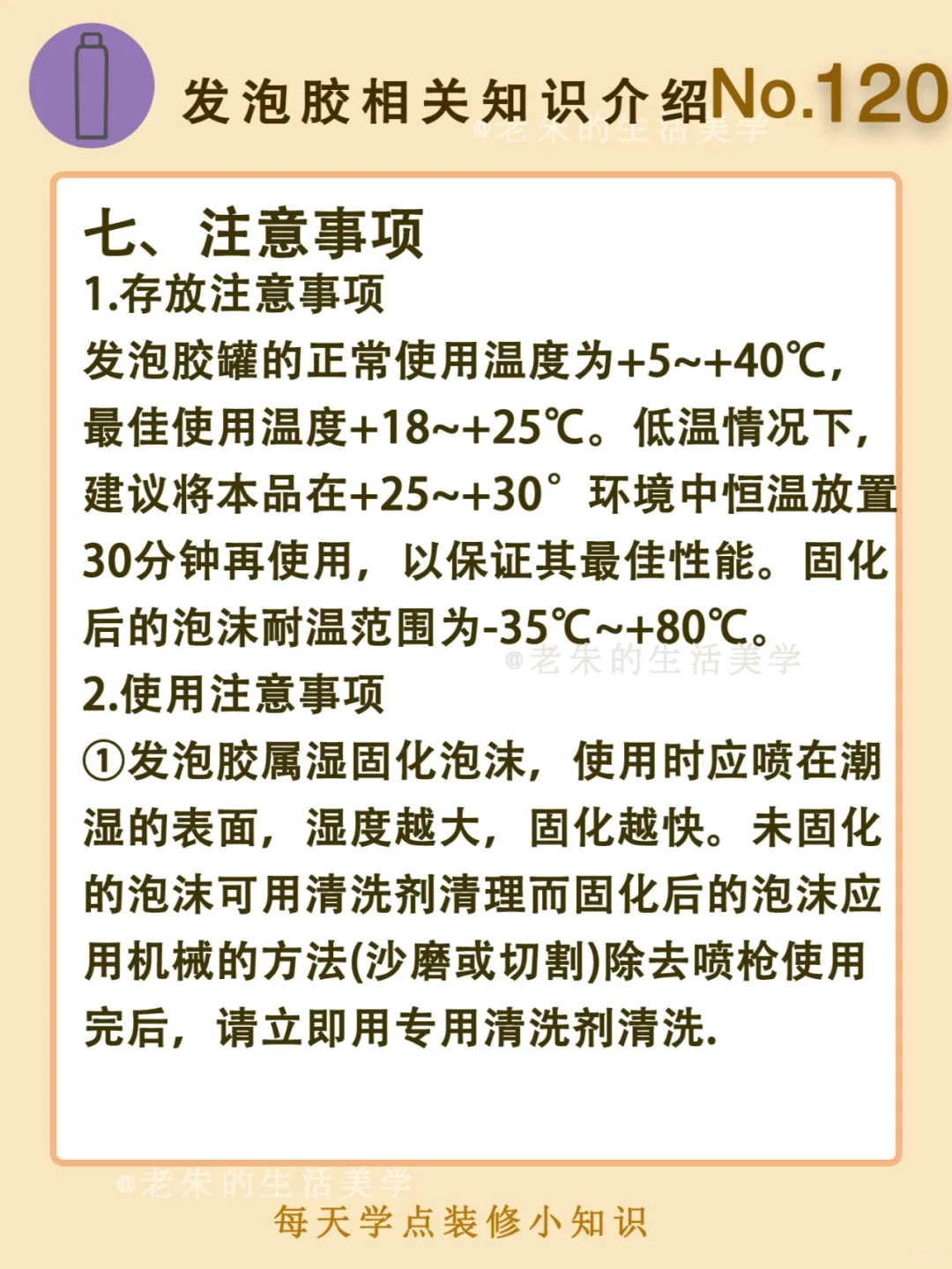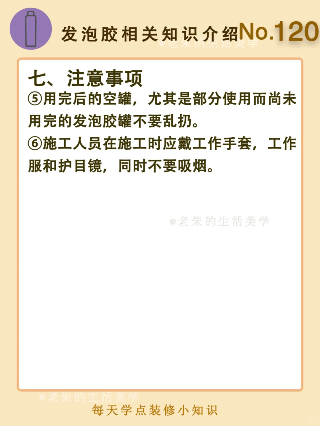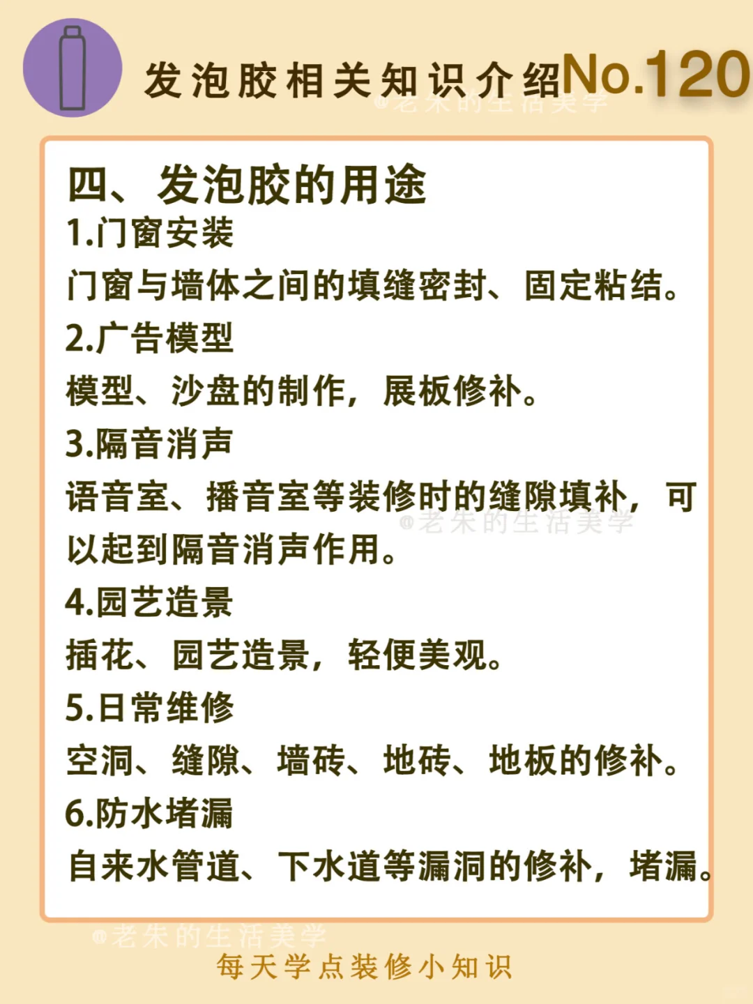 🔆 一、发泡胶是什么 二、发泡胶的规格分类 三、发泡胶的优点 四、发泡胶的用途 五、枪式发泡胶的使用方法 六、管式发泡胶的使用方法 七、注意事项 🔆 我是老朱 📍坐标天津 前上市公司金牌工长🏅 30年施工经验🛠 承接天津新房装修/老房改造 精心整理关于设计&施工&装修的攻略📝 关注我每日更新🗓 也可以在评论区留下您宝贵的想法与建议💓 让您装修不走弯路✅