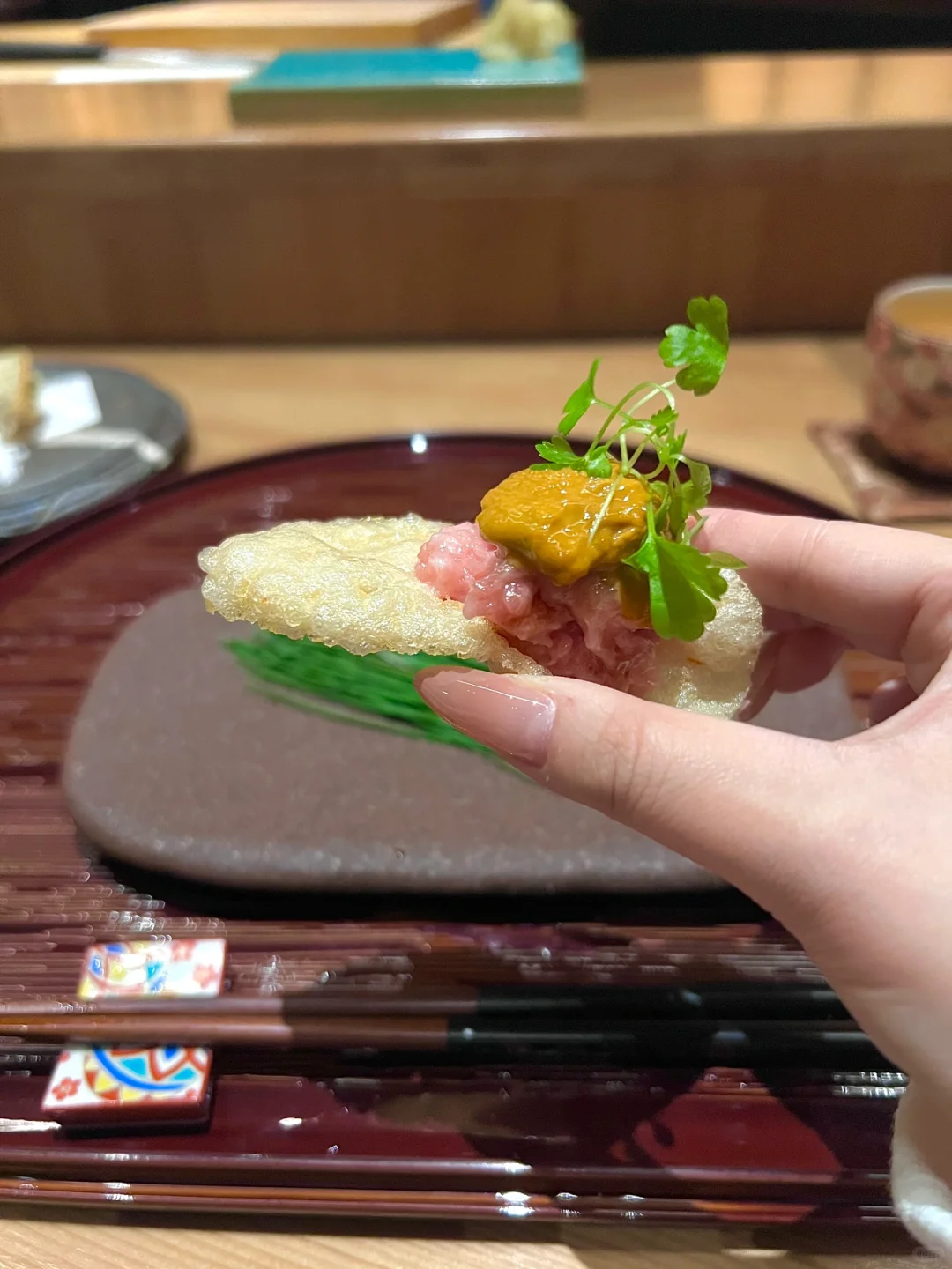 又是和小姐妹约会的一天~选了这家在弄堂里的omakase“鮨青枫”~环境蛮高端的,适合朋友情侣聚会~而且性价比很高诶,女孩子吃足够饱了~琵琶虾虽然样子有点丑萌🤣但吃起来口感Q弹有嚼劲,很爽口噢。酒肴啥的我就不一一说啦,最后的甜品栗子蛋糕还有主厨自己做的黑芝麻冰淇淋都好好吃呀😋之后等菜单更新了还会继续来吃的~敲重点:生日当天就餐可半价~~