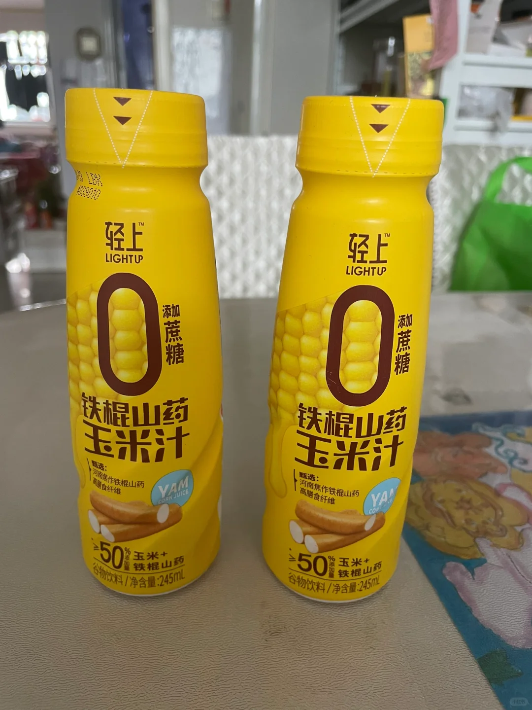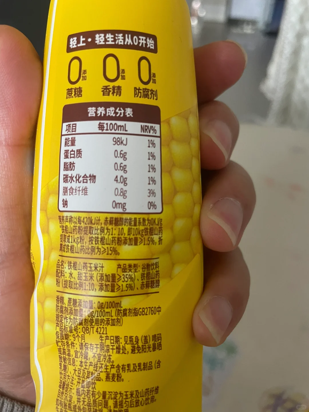4⃣️周一到周五上班时间紧张,孩子在小饭桌吃中晚餐,我和妻子又在减脂期,吃的会比较简单,有时候蒸一盘蔬菜,来一瓶鲜谷多轻上铁棍山药玉米汁就是一顿饭。这个饮料刚好加入了河北的非转基因甜玉米和河南的铁棍山药粉,饮品的甜味加的也不是蔗糖而是赤藓糖醇。
