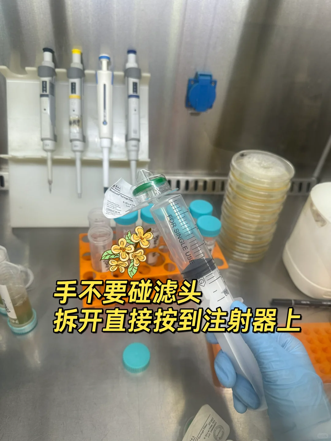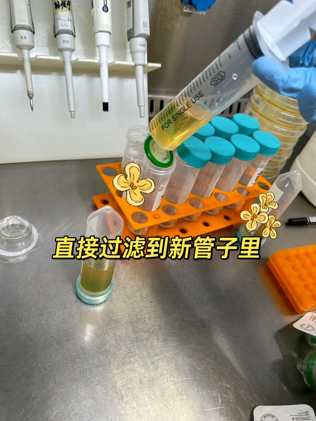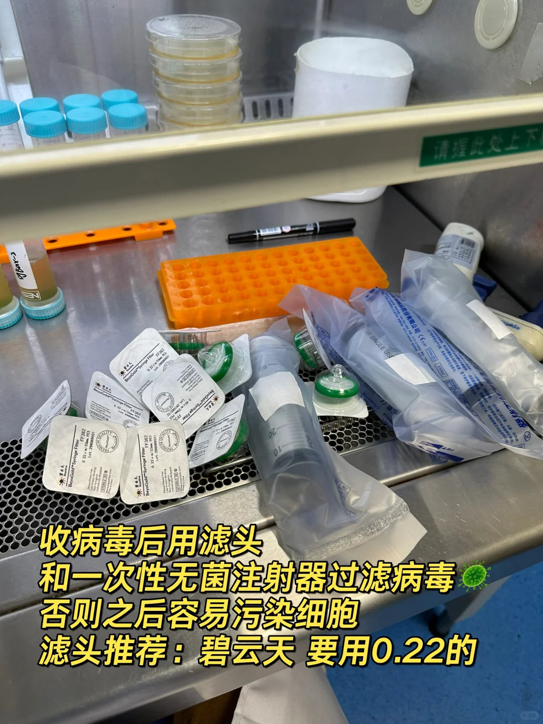 用无菌注射器💉先过滤病毒原液(参考图上),0.22滤头过滤比0.45的更好更干净。