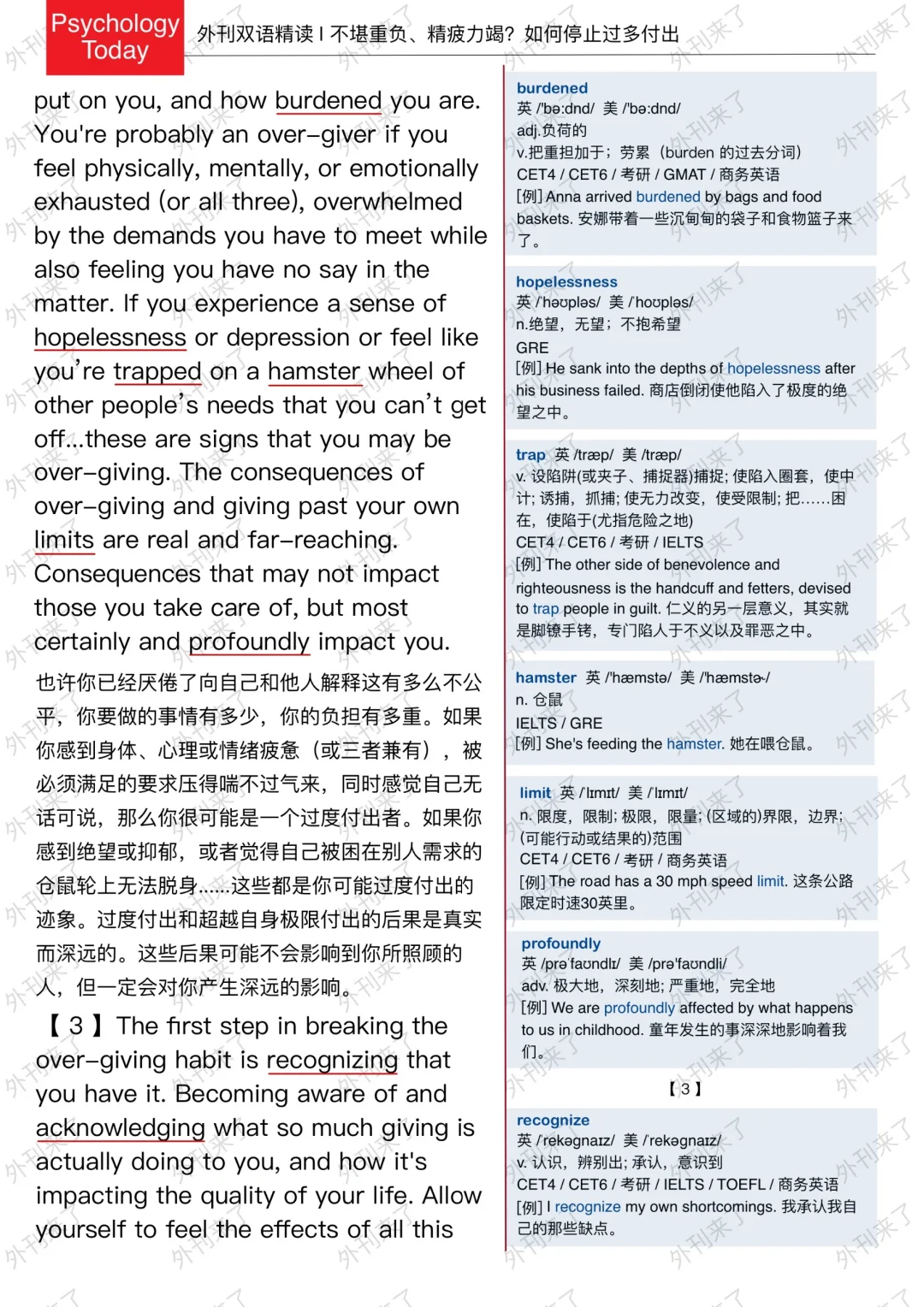🔥英语学习必备的外刊精读 ⭐选自Psychology Today ⭐每周会从原刊中选取多篇文章精读 🏆🏆重点单词⤵️ 🏅overwhelmed 被压倒的 🏅resentful 气愤的 🏅hamster 仓鼠 🏅profoundly 极大地 🏅honor 尊敬 🏅regardless 不顾 🏅paradigm 典范 🏅heed 注意 🏅genuine 真正的