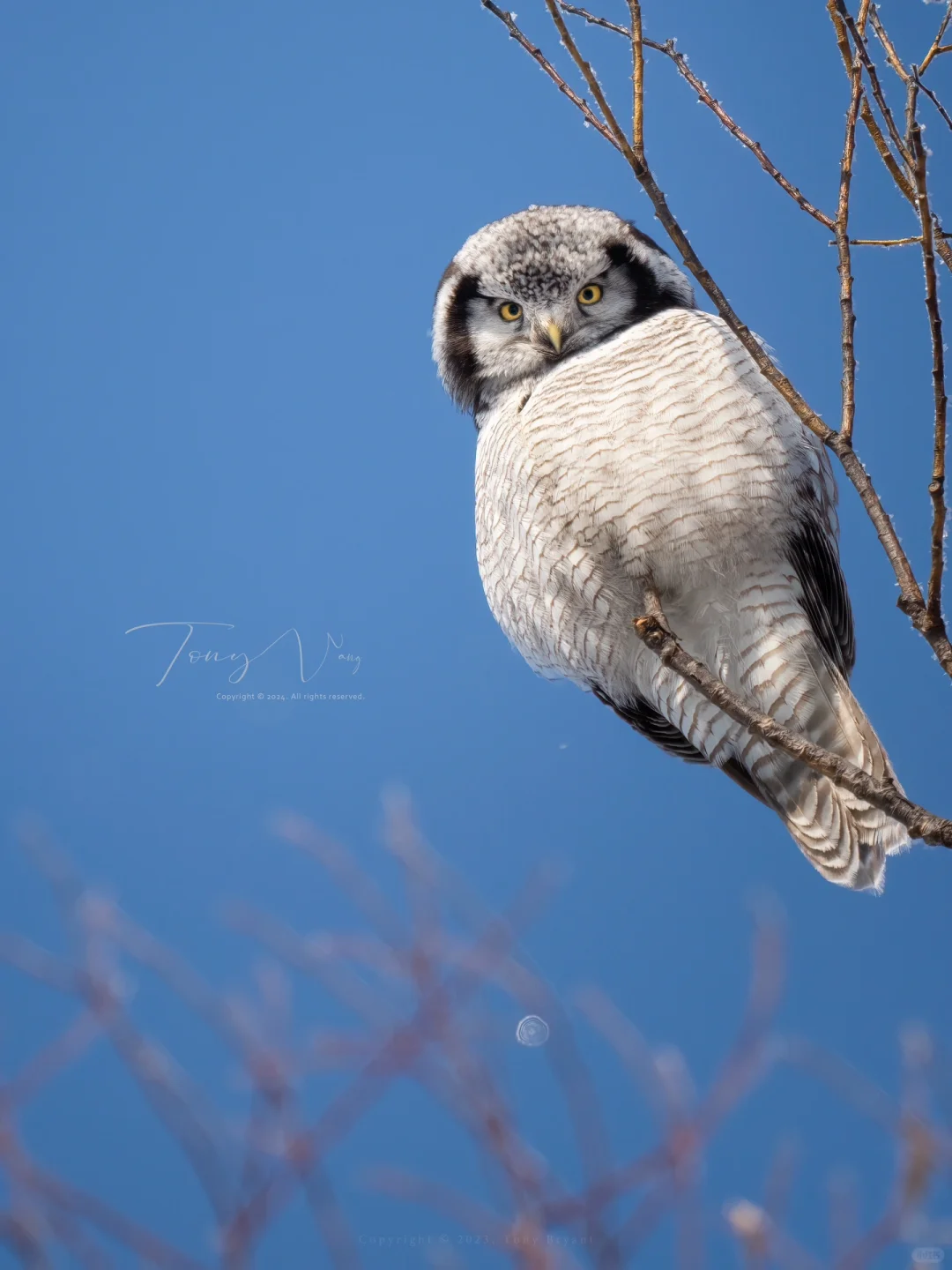 猛鸮Northern Hawk-Owl 说来也奇怪,猛鸮的英文名直译为“北鹰鸮”,但中文名顶着北鹰鸮这个名字的确实另外一种🦉[笑哭R]。这大概是因为猛鸮的行为确实和许多鹰类似,喜欢白天在开阔地活动,尤其喜欢站在高处,居高临下俯瞰整片田野,甚至能像隼一样在空中作悬停。虽然中文名里带了个“猛”字,但是这种小个子的猫头鹰不仅没有半点凶猛的气质,我们在乌尔旗汉见的猛鸮一个个都圆滚滚的,在寒风中蓬成毛球,反倒让人感觉超级萌[色色R]