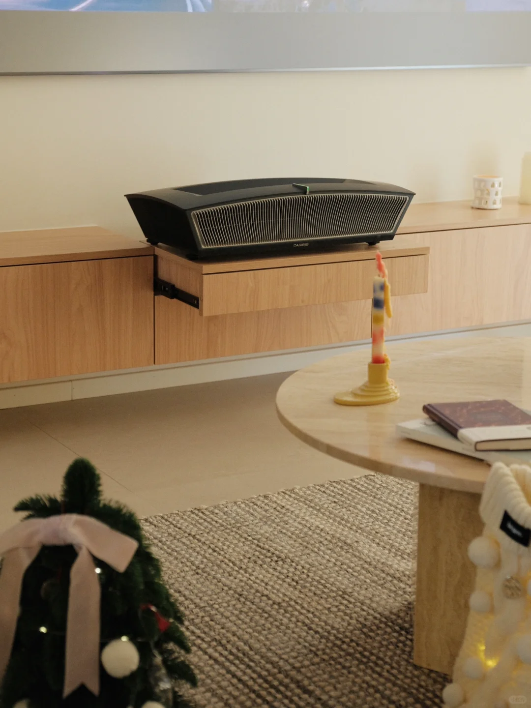 6️⃣不做电视背景墙,定制悬空电视柜,以后换更大的电视也不会受到限制~因为我家是📺激光电视,设计的电视柜中间是做的一个抽屉盒子,可伸缩,看电视的时候就抽出来,不看推回去即可,悬空的打扫卫生非常方便👍🏻,台面放些小摆件就很好看啦!