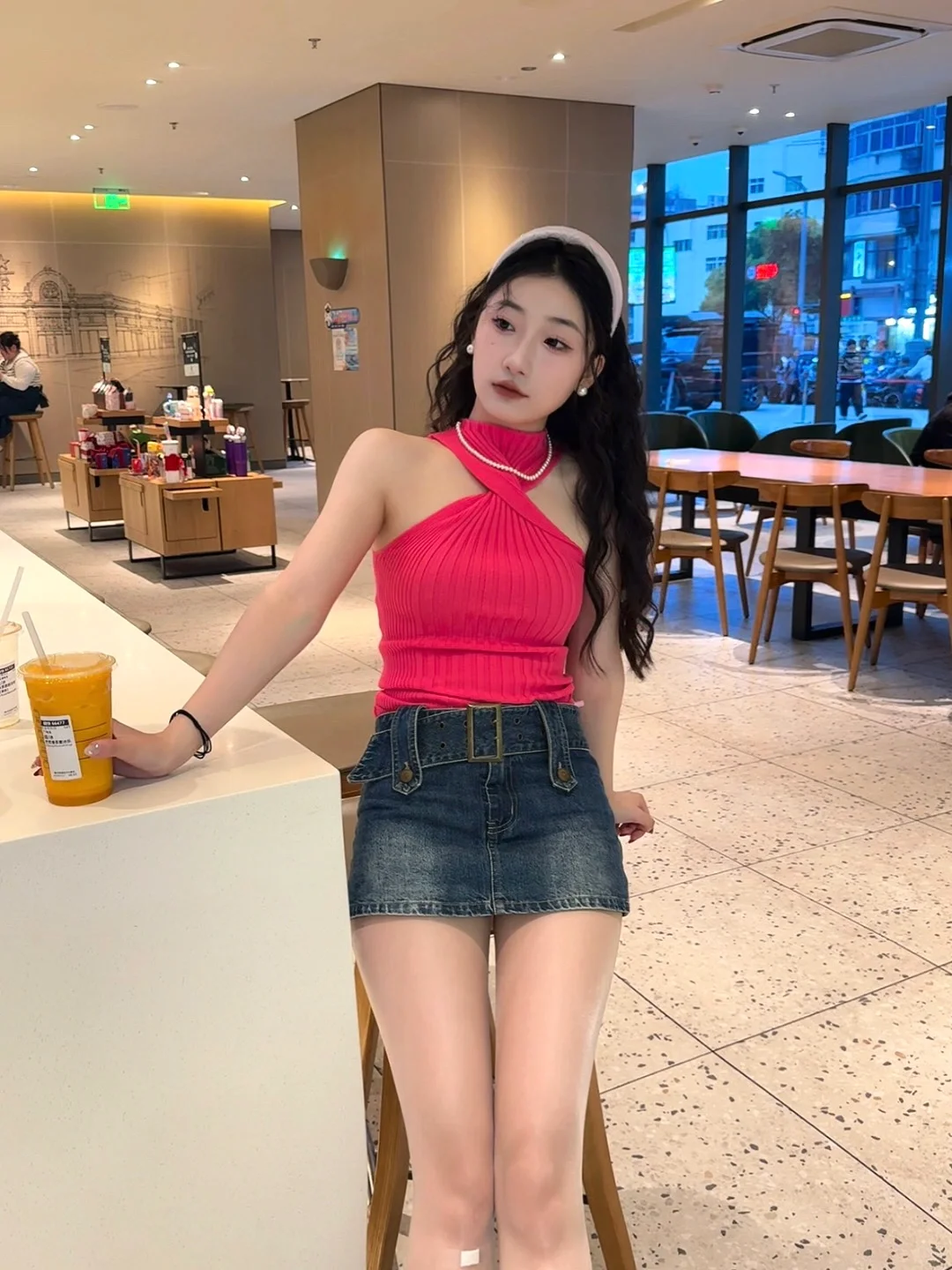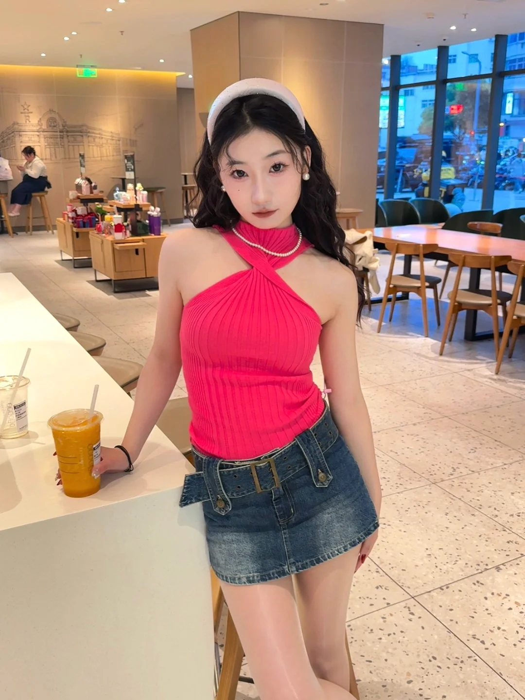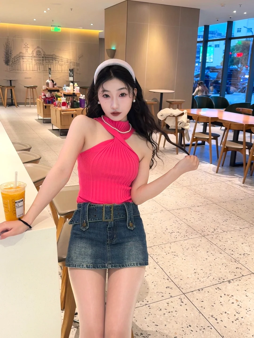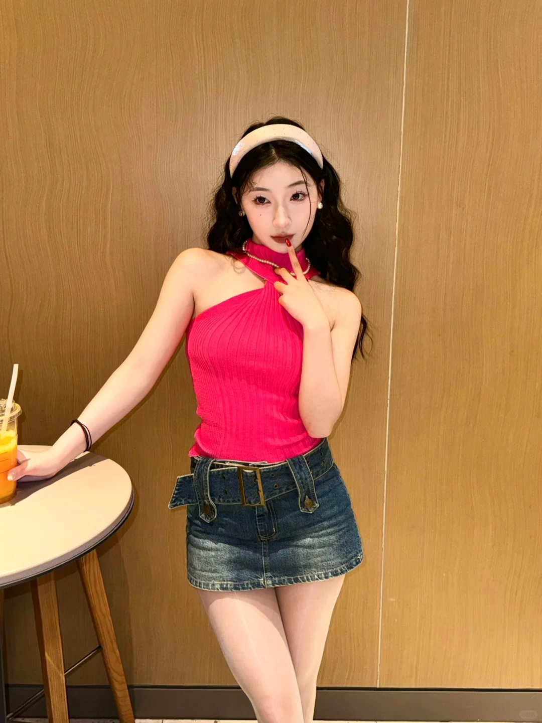 玫红色针织背心+牛仔短裙 感觉好芭比啊 这种亮色系感觉挺辣妹挺显白的