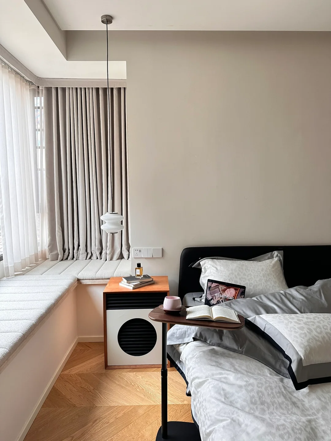 ☑️ 窗帘与墙漆颜色相近,整体协调不显乱,一整个温柔住!