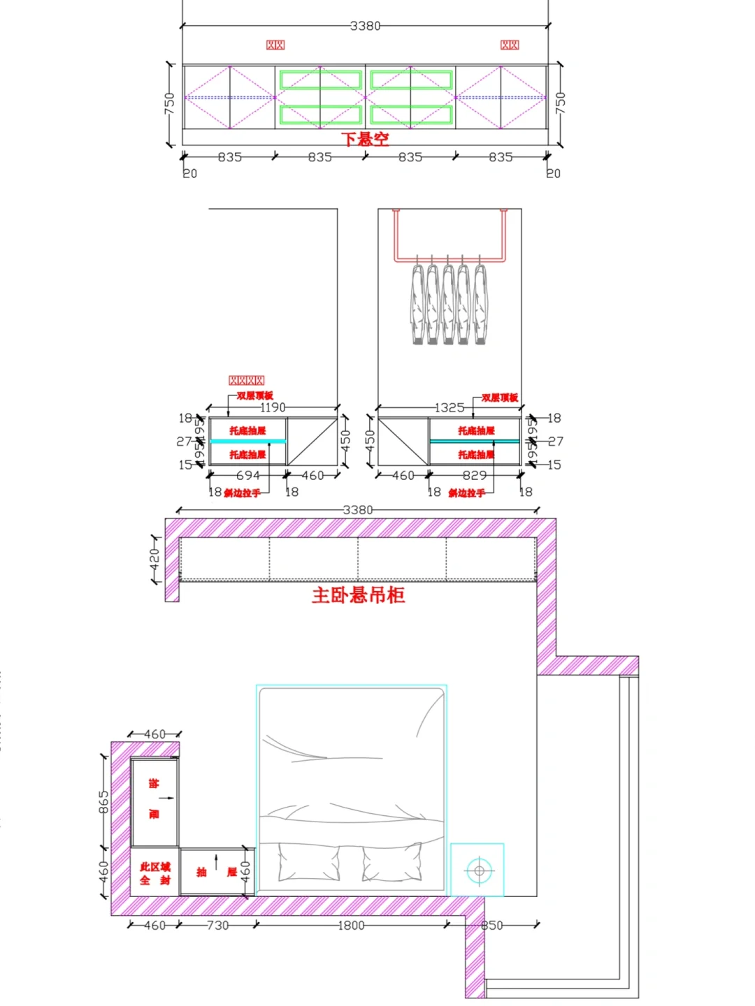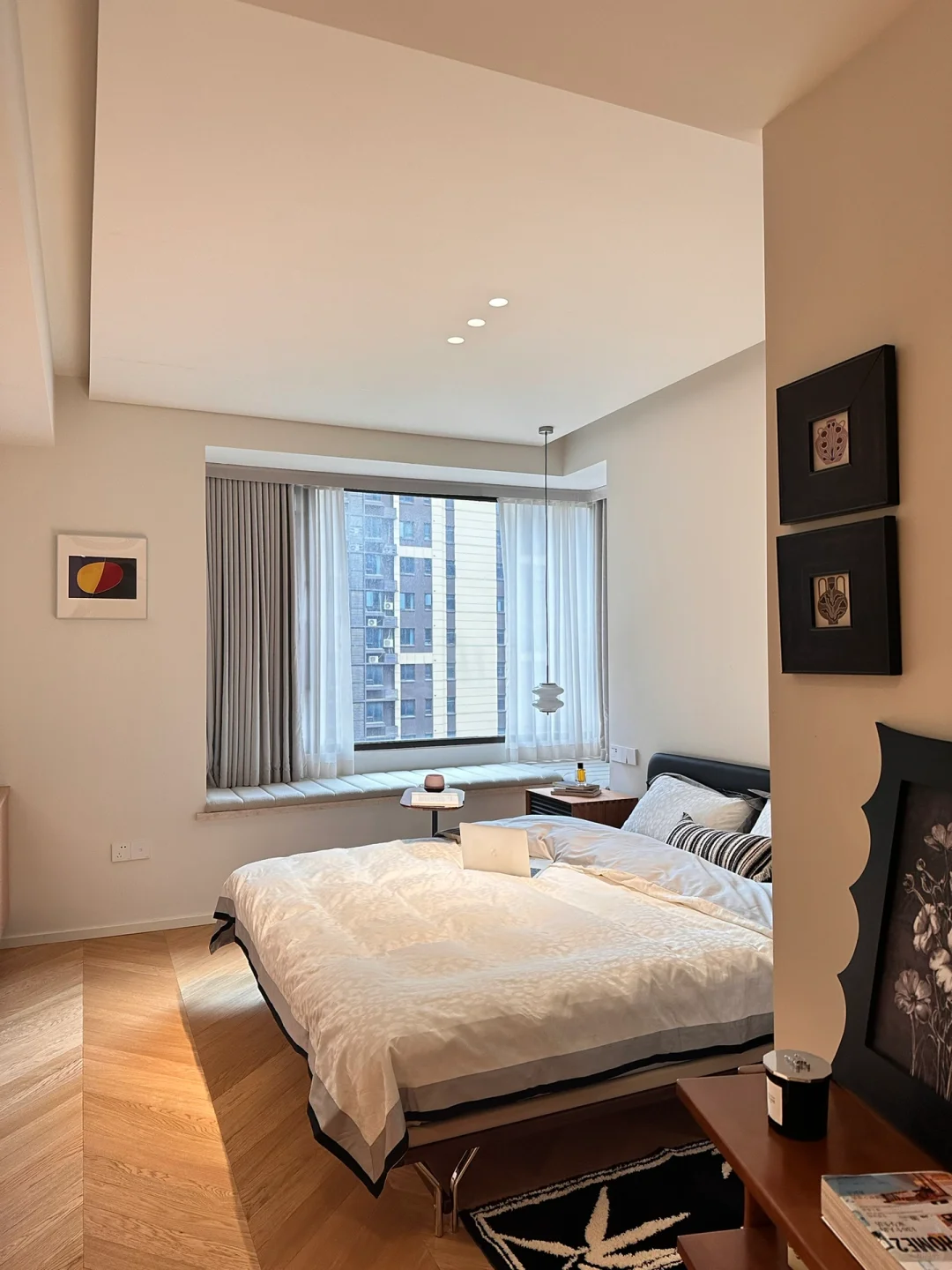 ☑️床头左侧是成品床头柜,右侧定制抽屉转角柜代替床头柜,留白空间设计为次净衣区,让卧室空间不局促
