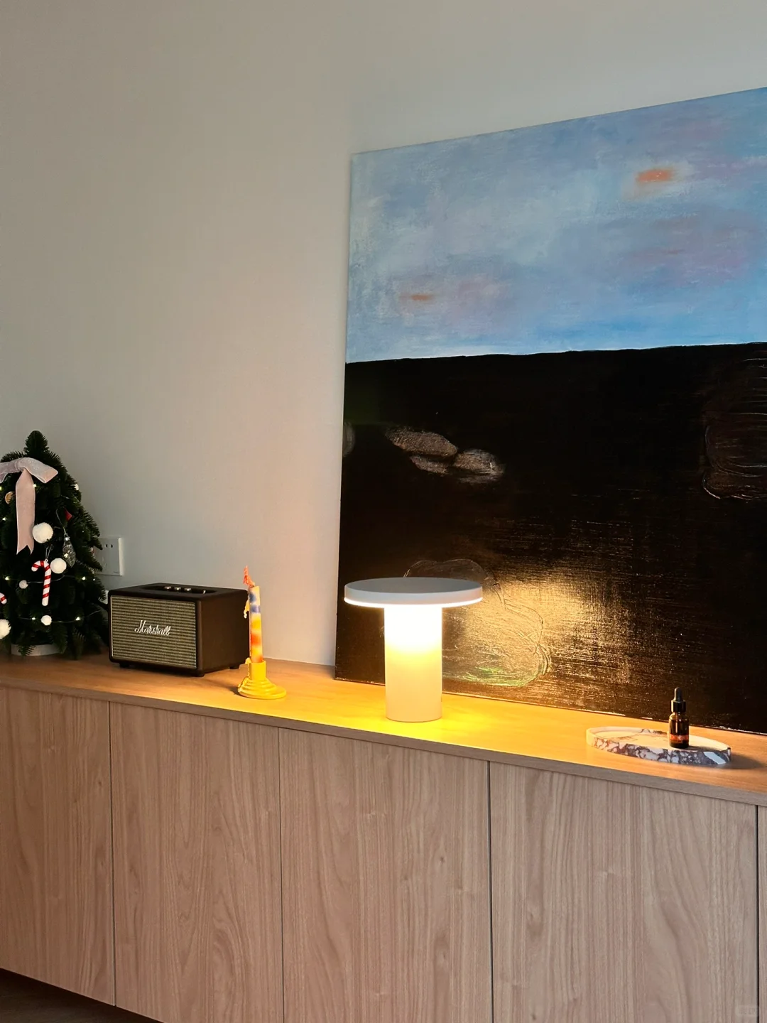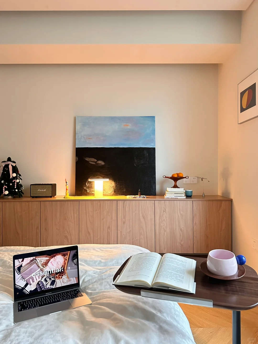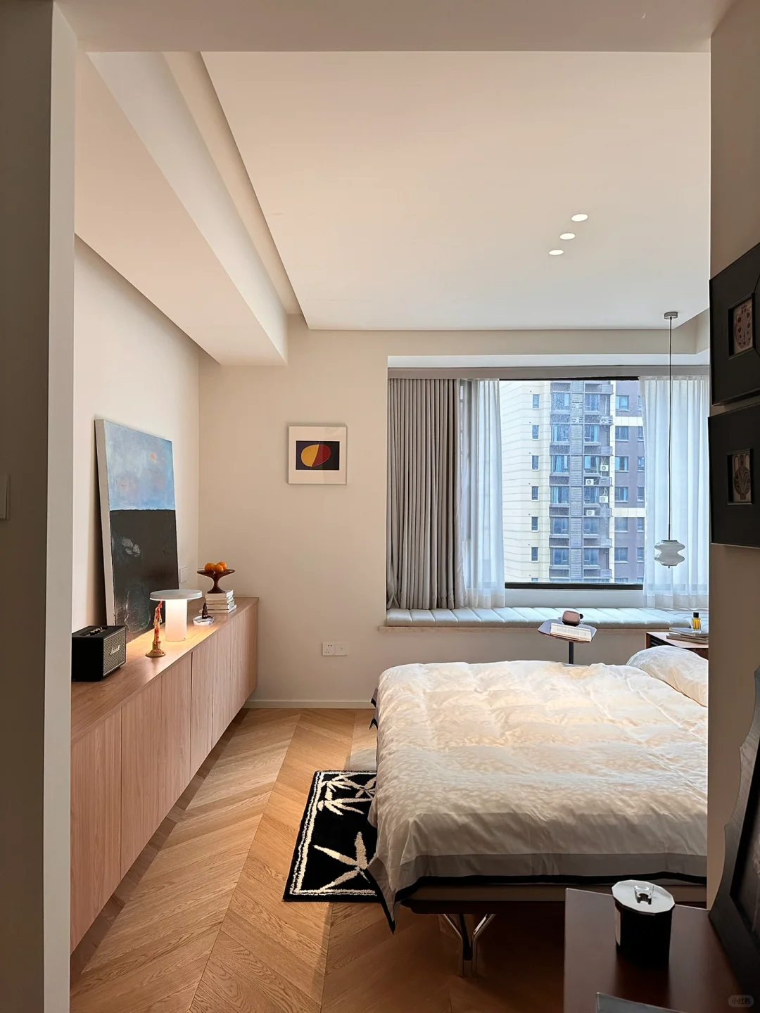 ☑️床尾定制一排储物柜,上面墙留白,不仅增加了储物空间,又放大空间,还能利用白墙作为幕布功能,打造🎬小型电影院