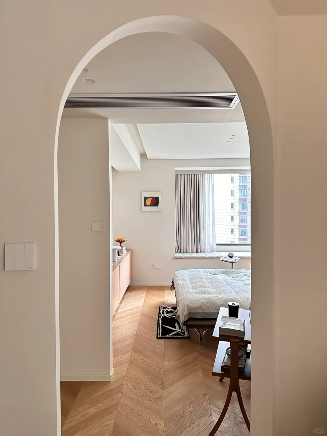 ☑️用弧形门洞连接睡眠🛌区和衣帽间👗,长虹玻璃推拉门进入卫生间,很有仪式感