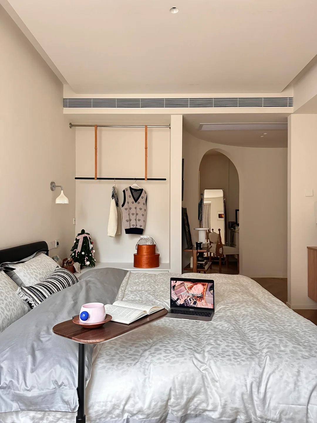 ☑️开放式挂衣区+转角抽屉替代床头柜,可以放置平时的隔夜衣服和随手物品、📚书籍,还可以搭配好第二天要穿的衣服,日常生活更方便