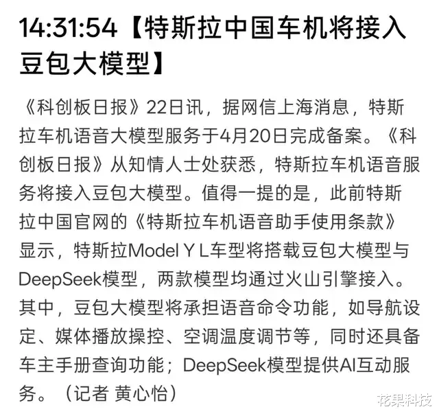 此前特斯拉中国官网的《特斯拉车机语音助手使用条款》中显示,特斯拉 Model Y L 车型的车机语音大模型将由豆包大模型和 DeepSeek 模型提供,两款模型都通过火山引擎接入。