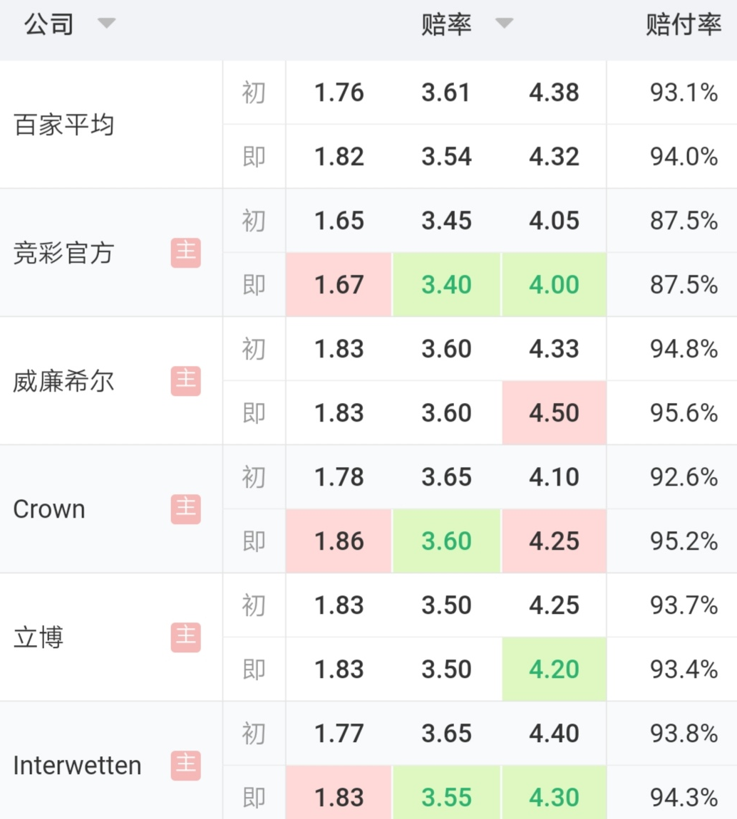 欧洲赔率数据:
