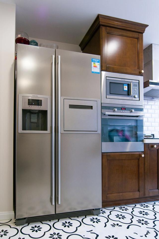 厨房,内部的空间比较大,虽然是定制的实木柜作为橱柜,但是也留了足够的空间放下一个冰箱,冰箱整个嵌入的设计非常的好看,几乎厨电都是可以定制到柜子里面,比如烤箱,微波炉等,厨房的内部的装修设计更为好看和实用。