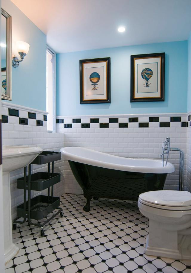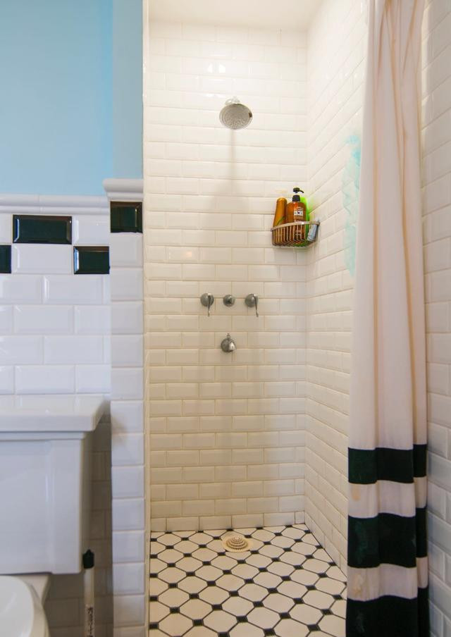 卫生间,做了严格的干湿分区,洗手台和浴室是相邻的,用的是浴帘作为隔断,最有趣的是室内的瓷砖装饰。