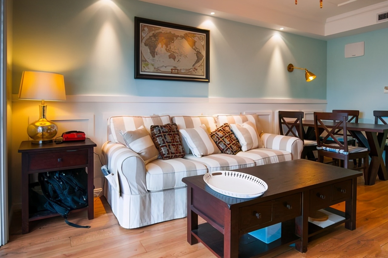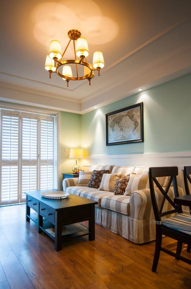 客厅,背景墙的装饰好看极了,上半墙做了蓝色的乳胶漆色调装饰,下半墙则是做了石膏板的背景墙,还做了造型,整个背景墙看起来就很美很出色了,中间一幅装饰背景画,美式风的设计确实大气,复古感也很强。