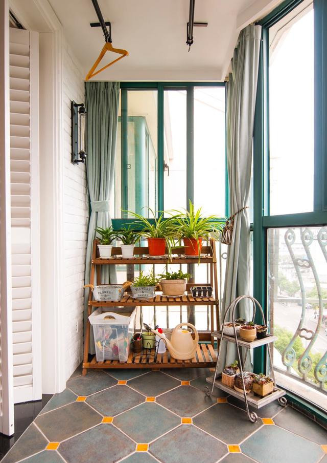 阳台的地面瓷砖做了复古瓷砖的搭配,这样的搭配真的很少见了,但是光着脚丫子踩还是蛮舒服的,你们说是吧?