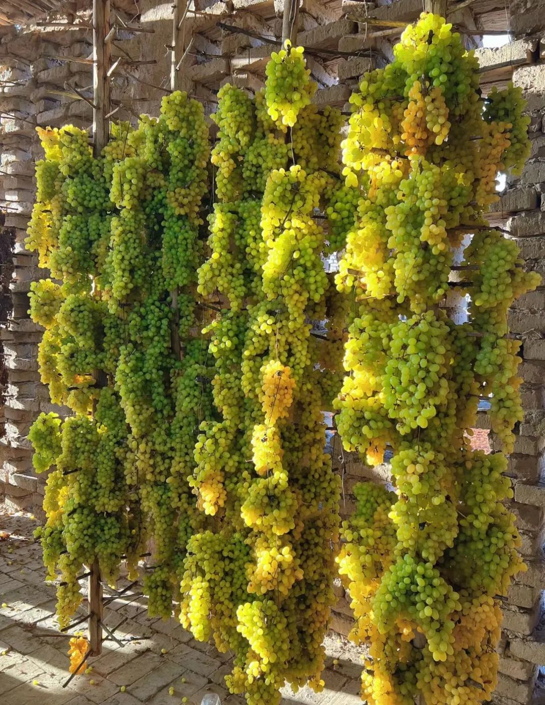 在吐鲁番火焰山下的村落间,一座座土坯砌成的方形建筑星罗棋布。四壁镂空如蜂巢,走近看,一串串翡翠般的葡萄从木架垂落,干热风穿墙而过,空气中弥漫着蜜糖般的芬芳。