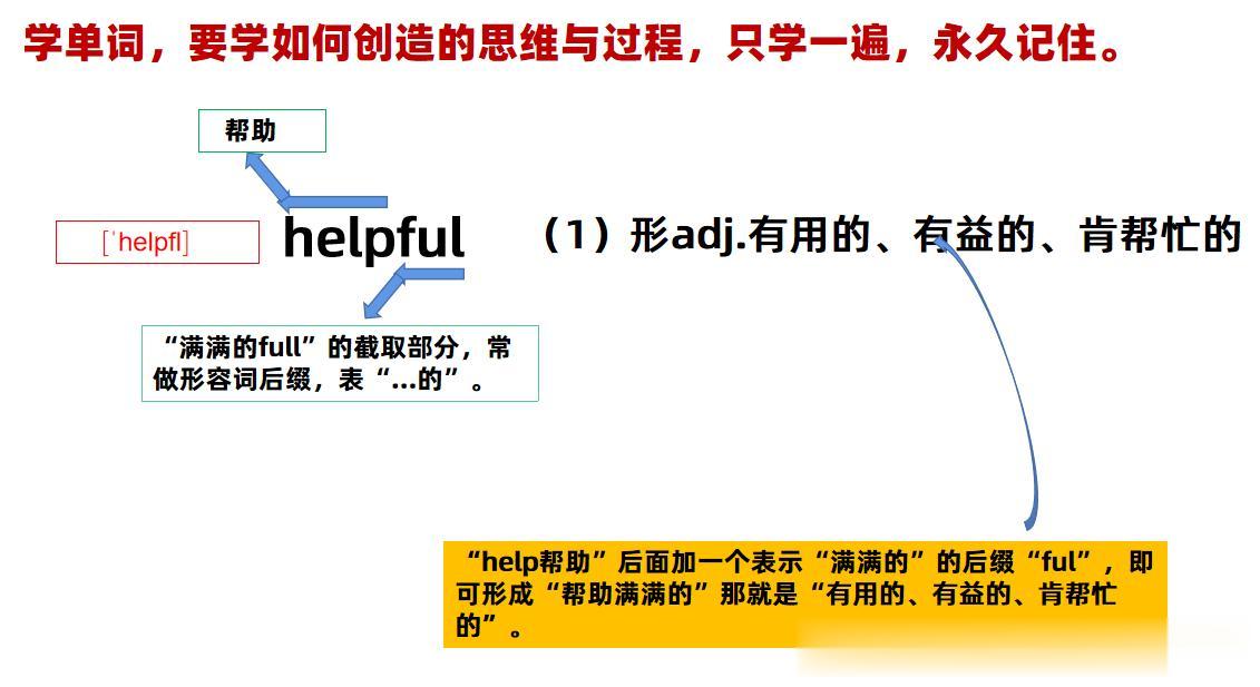 “help帮助”后面加一个表示“满满的”的后缀“ful”,即可形成“帮助满满的”那就是“有用的、有益的、肯帮忙的”。详细解说图如下: