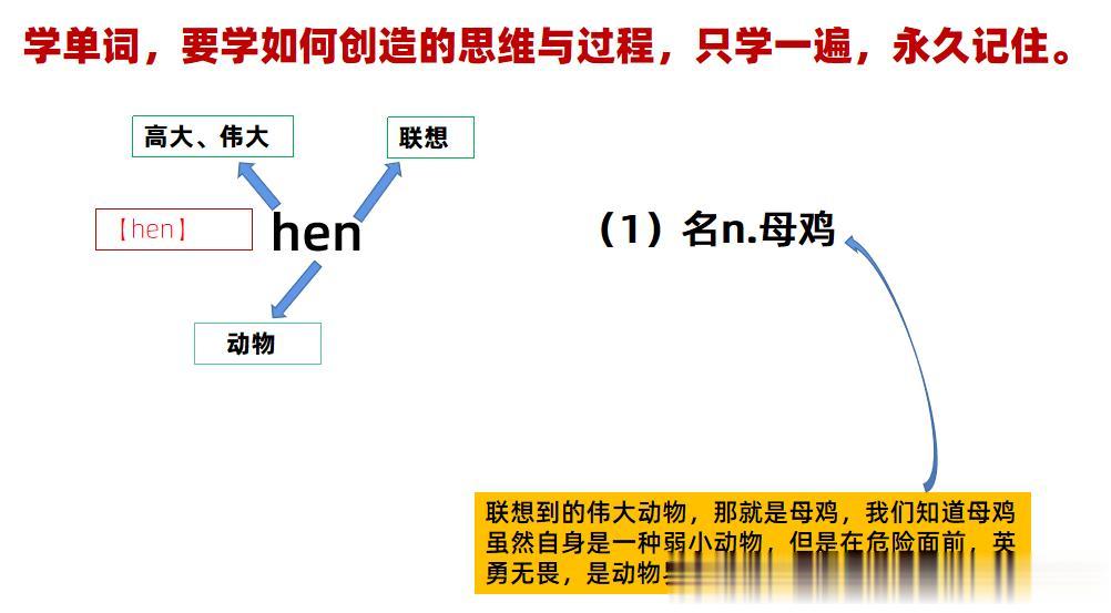 其实只要我们知道“母鸡”是伟大动物的象征!我们知道母鸡虽然自身是一种弱小动物,但是在危险面前,英勇无畏,是动物界里伟大形象的代表。善于西方人的这种把你斩杀了后还说没杀你的思维,你也会创造单词!你看西方古人就用用“联想到的伟大动物”描绘了母鸡!因此他们首先写出表示“伟大的动物”的“he”,最后用表示“联想”的“n”进行补充强调即可!详细解说图如下: