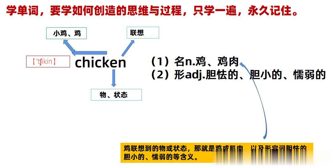 我们回到西方古人也会利用“小鸡”去创造“肌肉”,但是他们更会利用“小鸡”去创造“、胆怯的、胆小的”思路上来!其实西方古人将“鸡肉、胆怯的、胆小的”描绘成“鸡联想到的物或状态”,因此他们首先写出了表示“鸡”的“chick”,然后后面加一个表示“物或状态”的“e”,最后用表示“联想”的n进行补充强调。详细解说图如下: