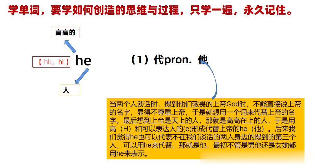 “he”最初是两个人谈话时,提到他们敬畏的上帝God时,不能直接说上帝的名字,显得不尊重上帝,于是就想用一个词来代替上帝的名字。最后想到上帝是天上的人,那就是高高在上的人,于是用高(H)和可以表达人的(e)形成代替上帝的he(他)。后来我们觉得he也可以代表不在我们谈话的两人身边的提到的第三个人,可以用he来代替。那就是他,最初不管是男他还是女她都用he来表示。详细解说图如下: