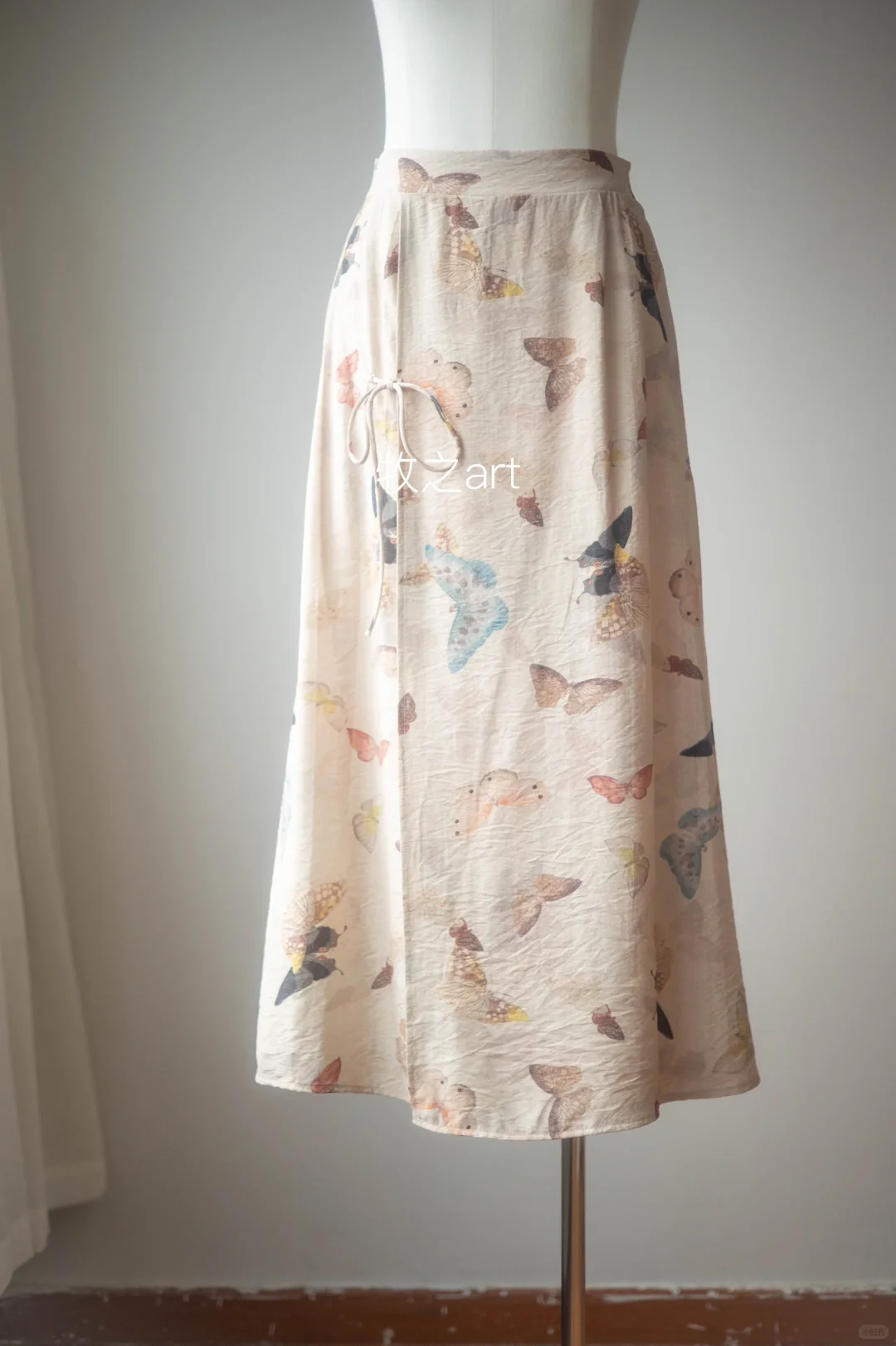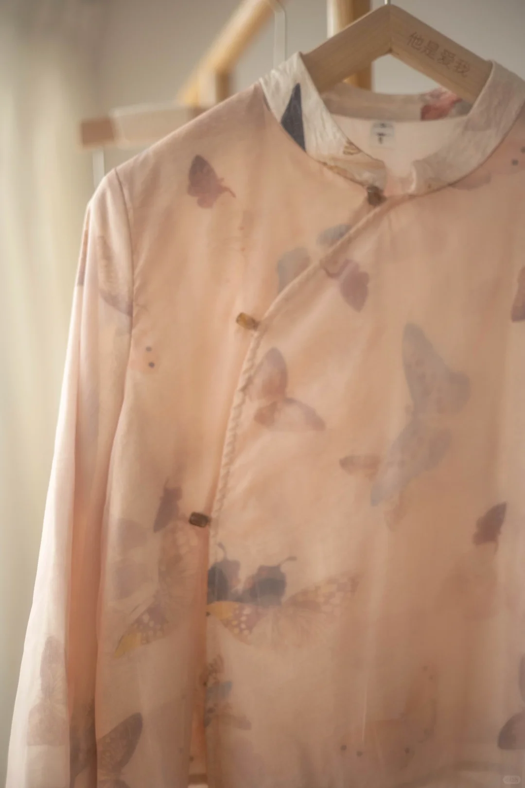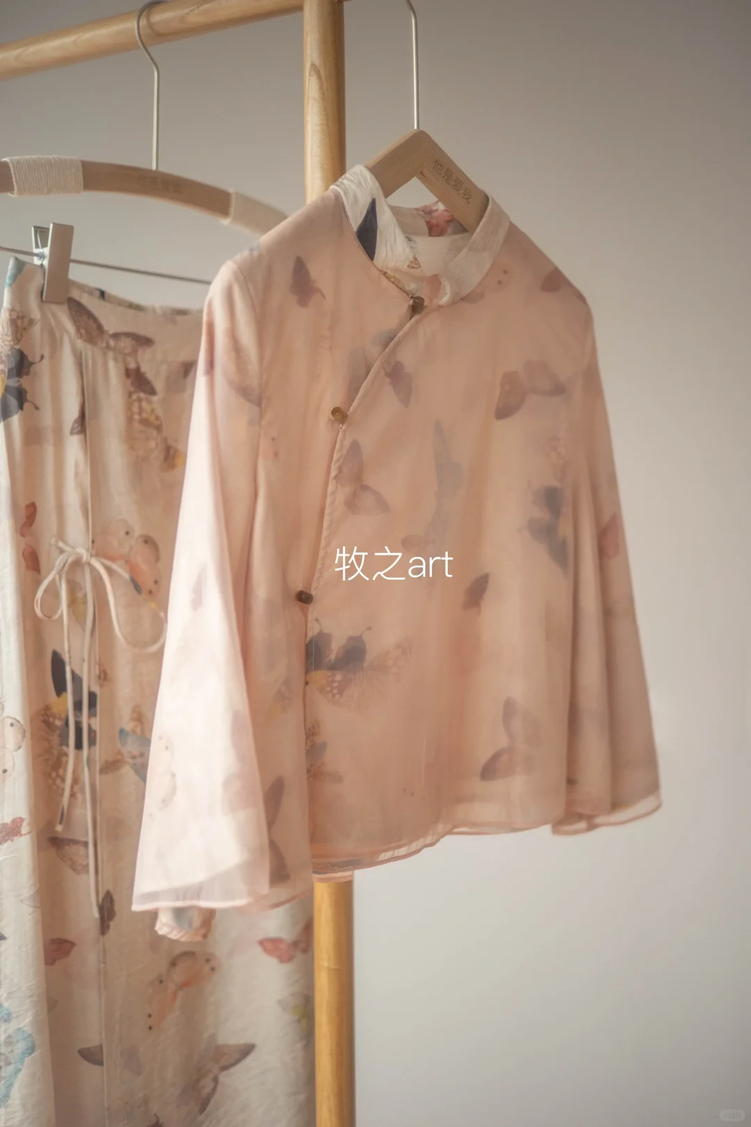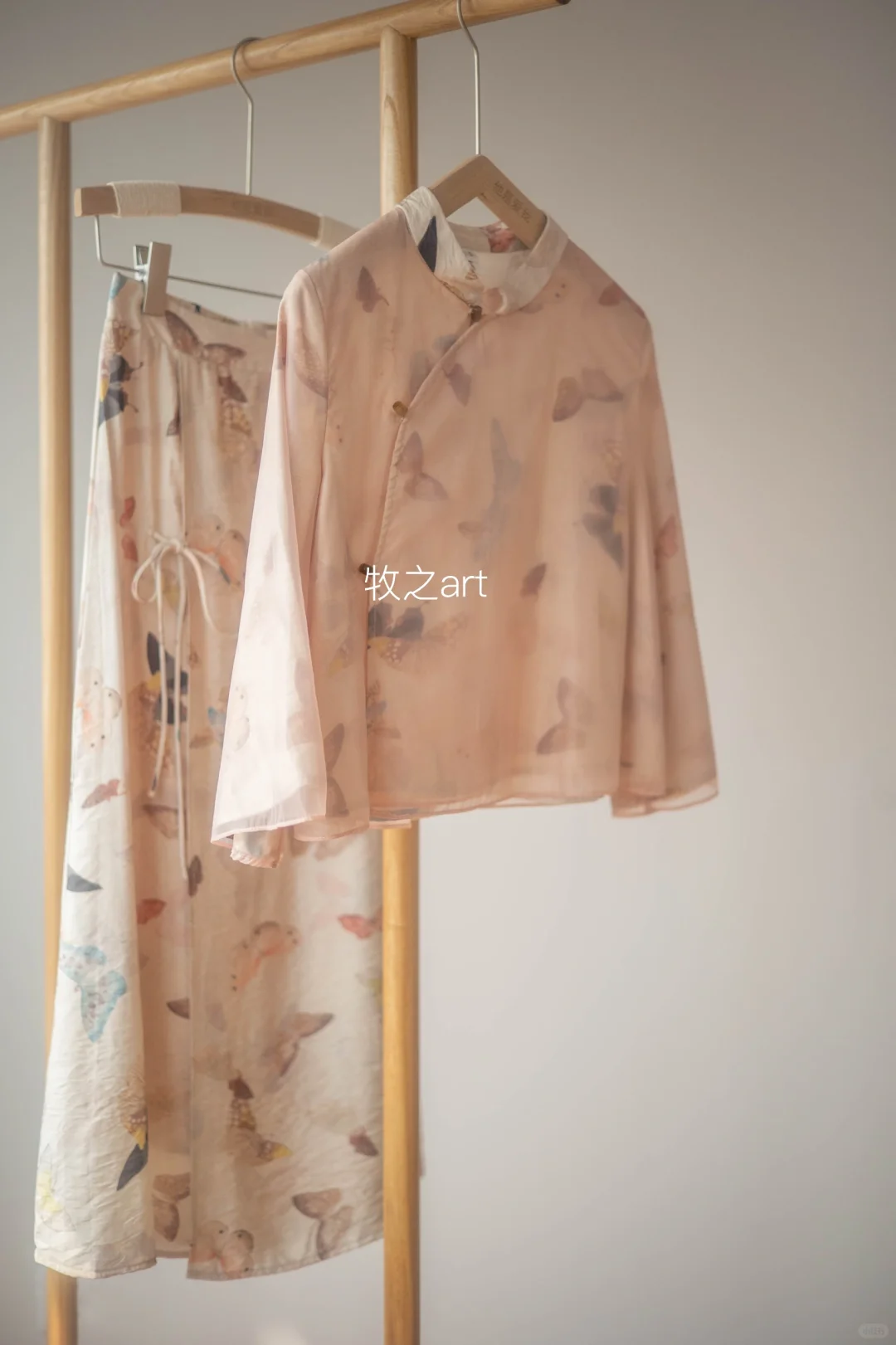 彩蝶舞芳华,新中式的清新温柔穿搭~ 温柔的粉色调,白皮肯定合适 黄皮黑皮也都可以穿,颜色不是亮粉色 不挑肤色的 上衣+半裙两件套 面料是丝麻,做了压褶工艺,外料加了一层同色系纱料,更仙了~ 版型显得身材比例特别好 上身有余量 又是遮肉显瘦的 -