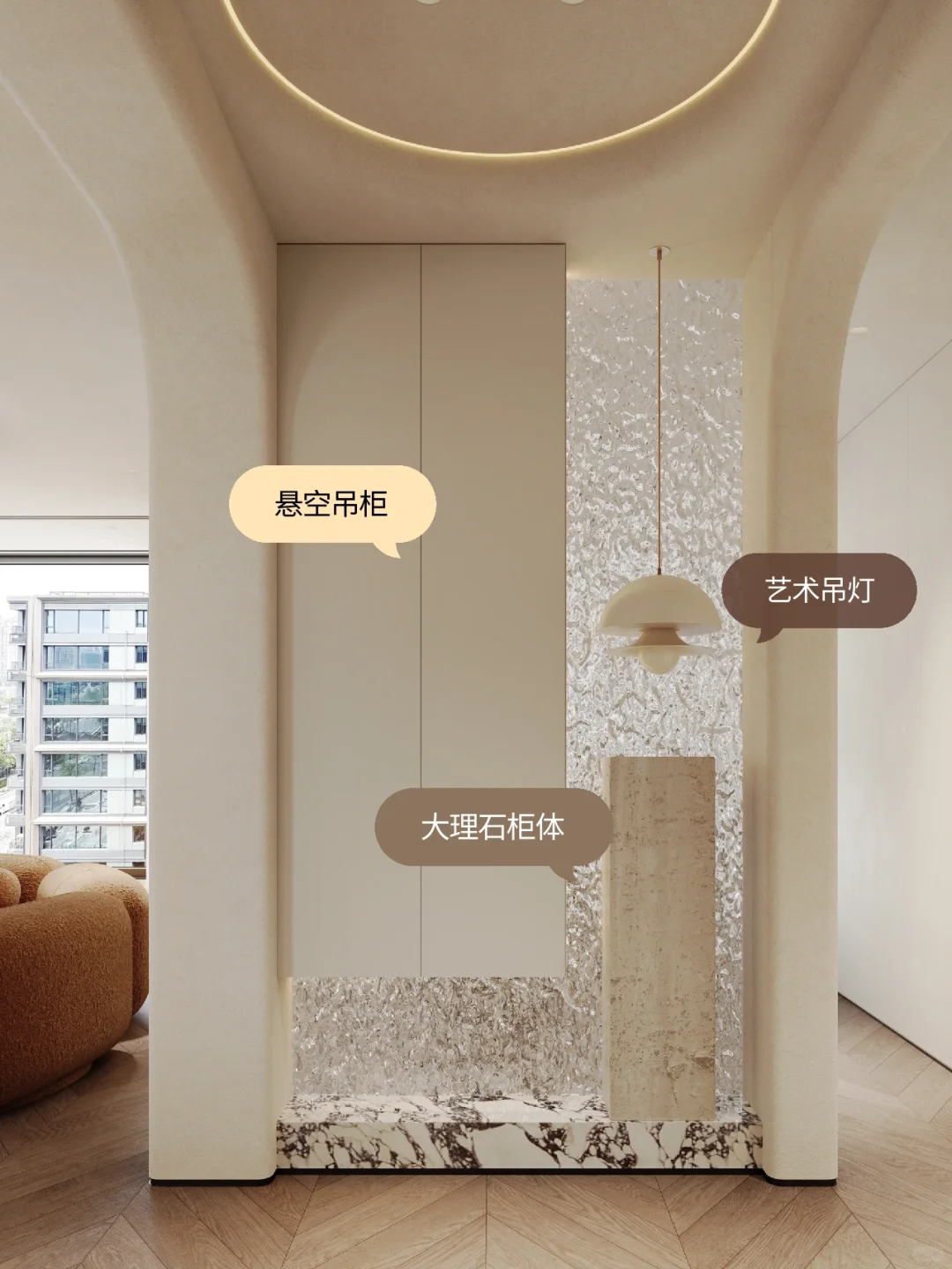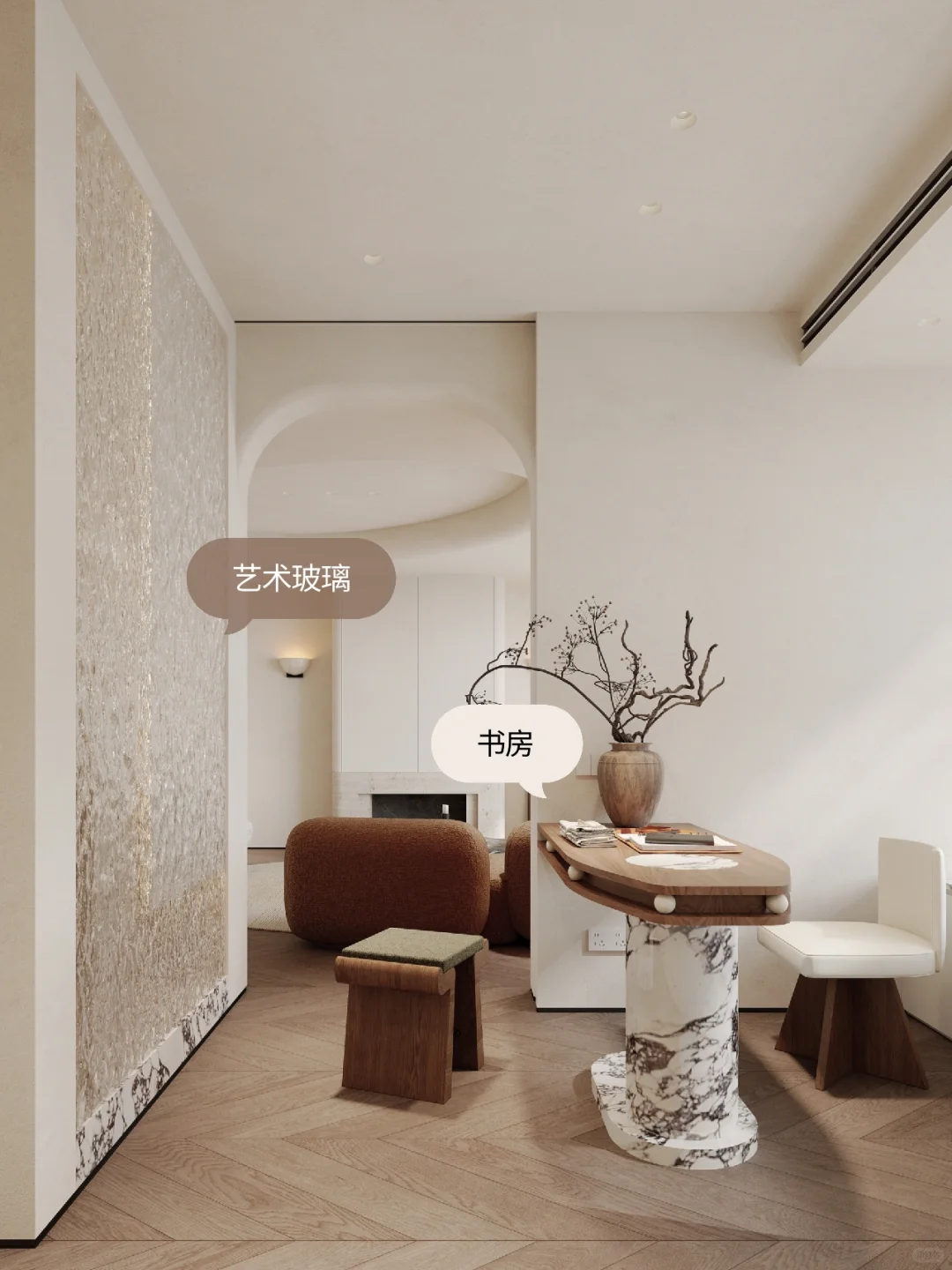 玄关+书房共16㎡空间,我们在入户门厅空间通过法式门廊的手法做环绕的空间动线,用艺术玻璃打造玄关空间自然、通透明亮,并引光入室至书房空间;用艺术玻璃作为玄关,不仅是入户的造景,也是书房的隔断,艺术玻璃仿造出水波纹质感,如同潺潺流水流入屋内,坐在书房欣赏更是惬意~玄关/书房/客厅的模糊边界更让空间沾满自由的气息![赞R]