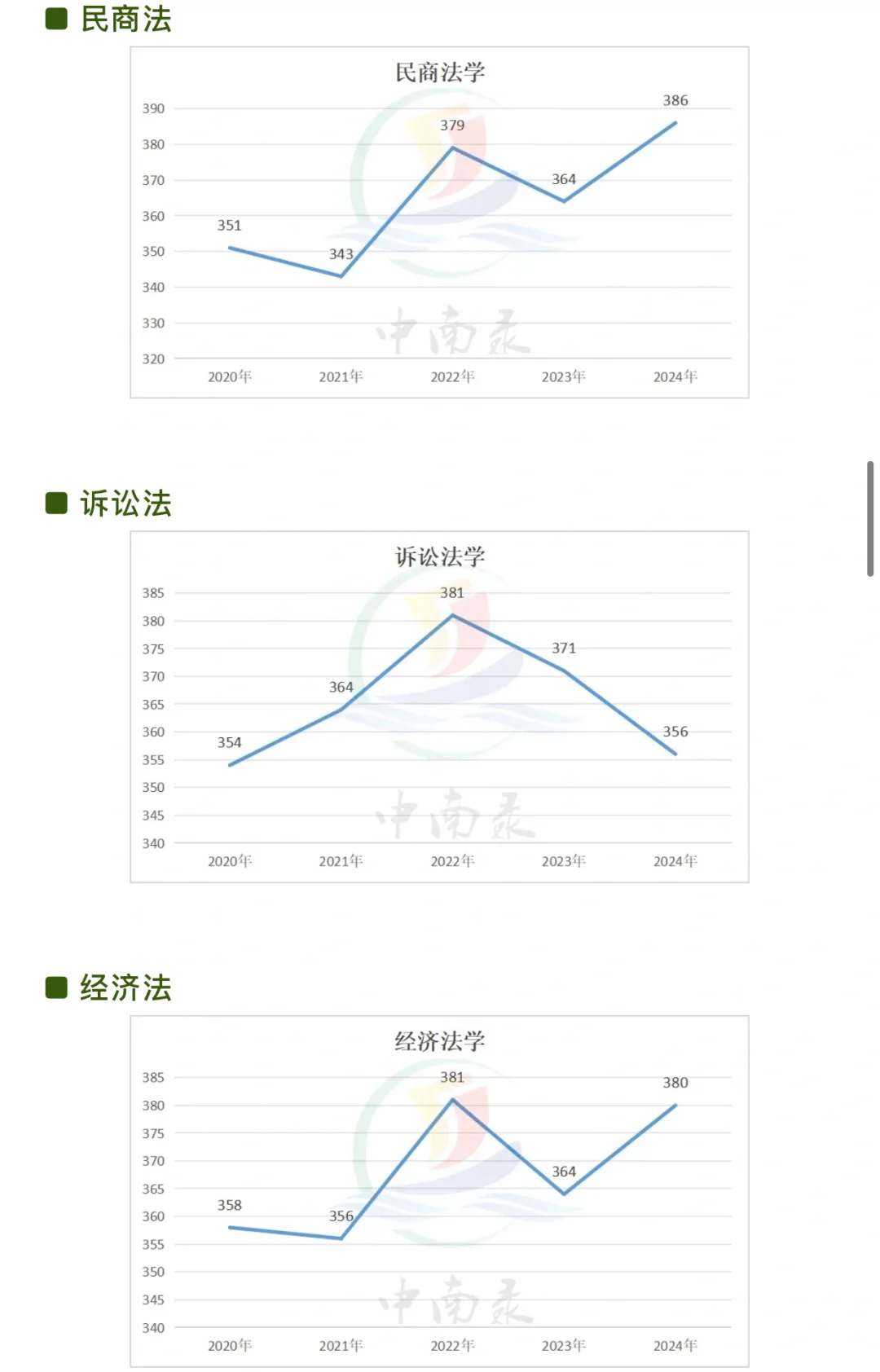 [向右R]例如:法学理论由去年的356分上涨到379分,涨了23分;民商法由去年的364分上涨到386分,涨了22分;国际法由去年的366分上涨到389分,涨了23分