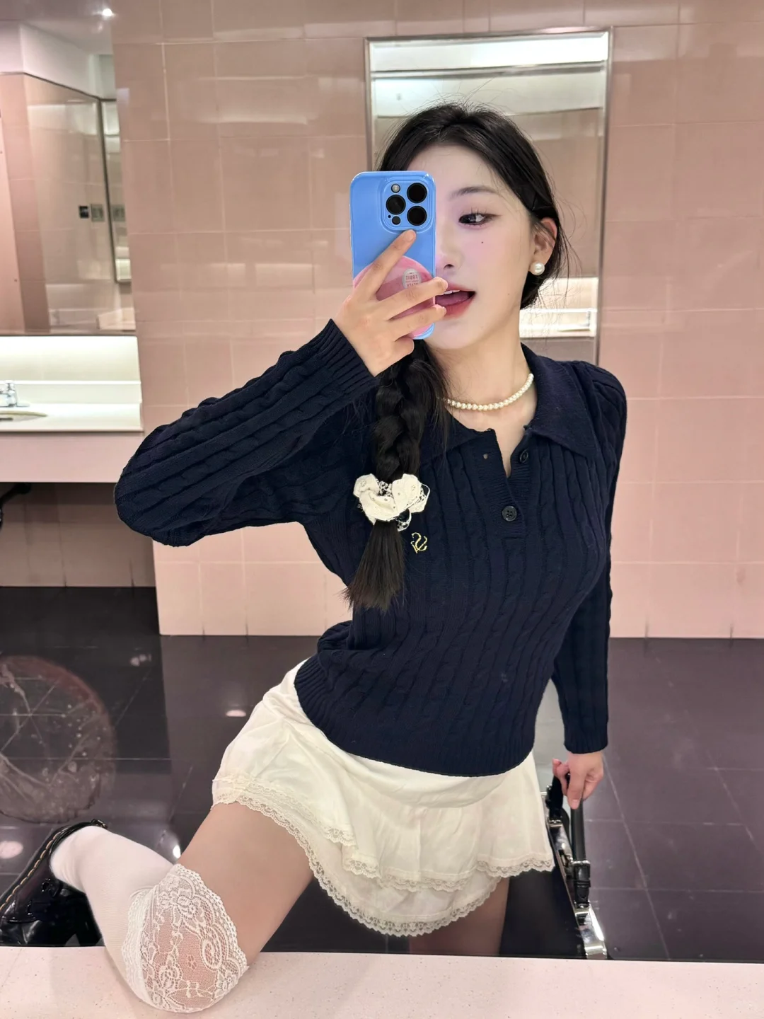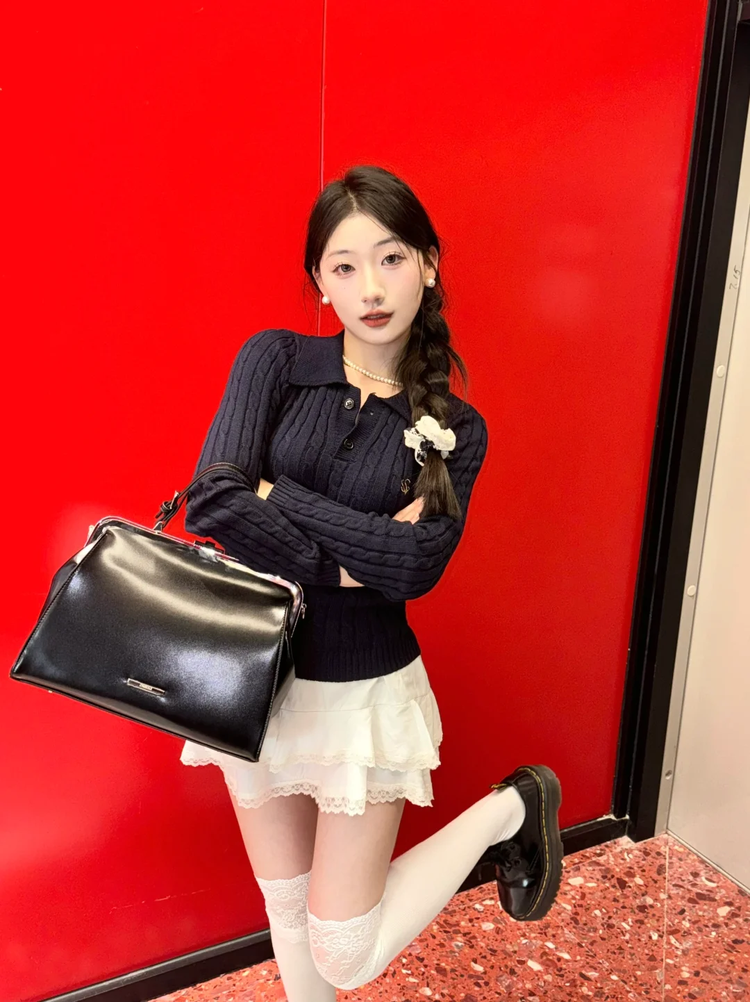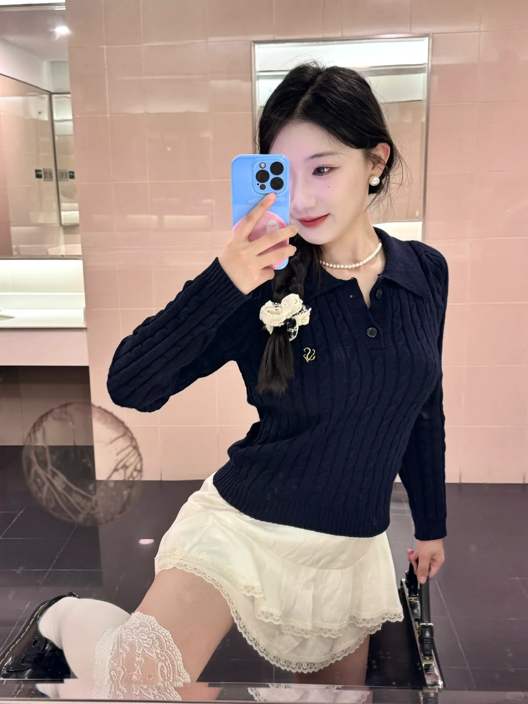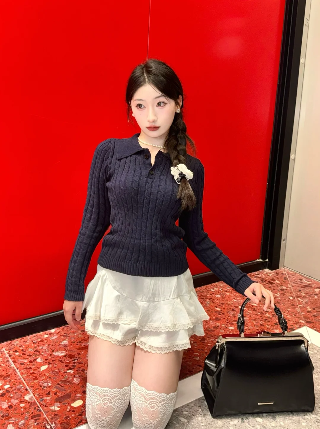 藏青色好显白啊 藏青色polo领针织衫+白色蕾丝蛋糕裙+白色蕾丝小腿袜 好学院好韩系啊 喜欢喜欢💕