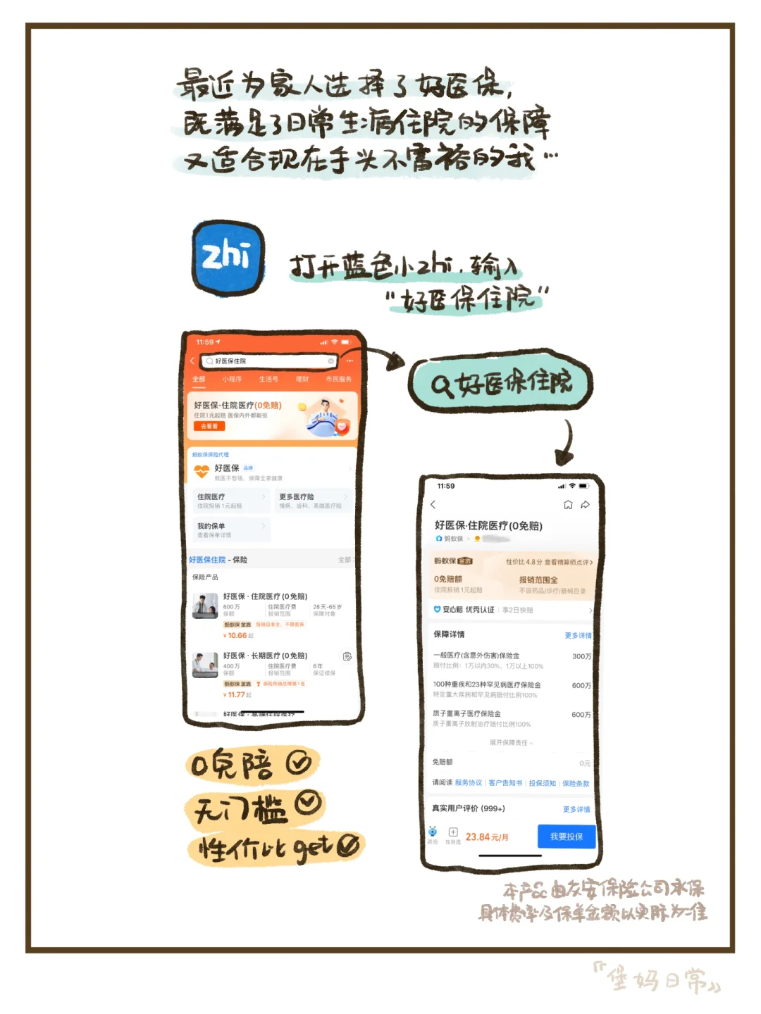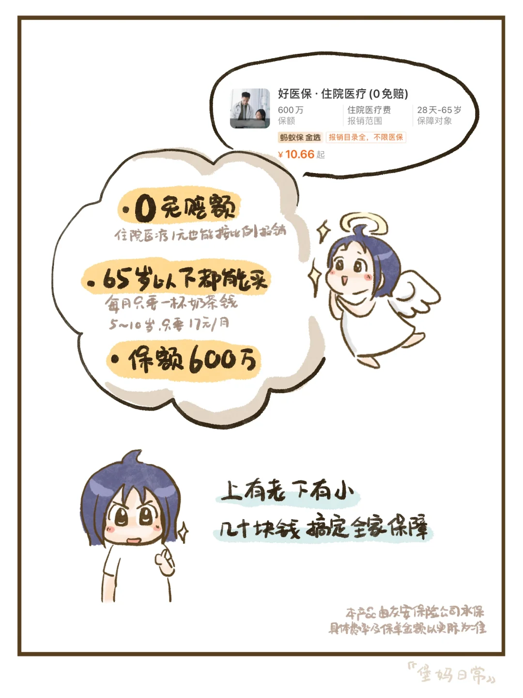 打开吱苻宝,🔍“好医保住院”就可以找到,主要看上了它0免赔额,责任内住院医疗花1元也都能申请报销,而且保额也不少,有600万,性价比真的不错~~适合我这种上有老下有小的家庭来着~[捂脸R][捂脸R]