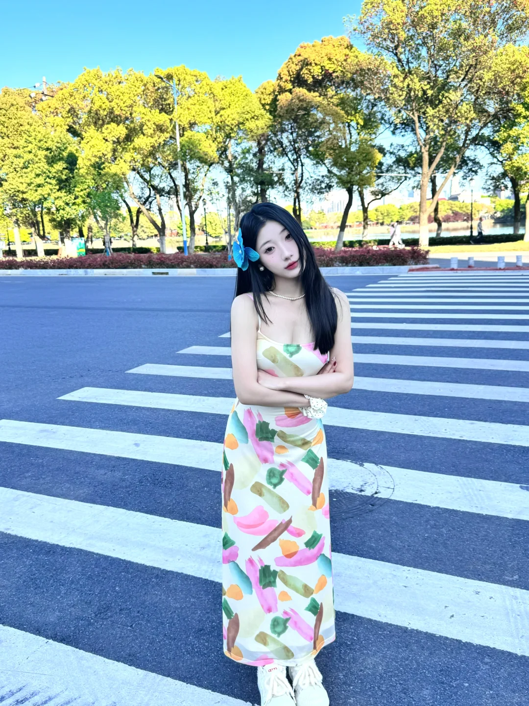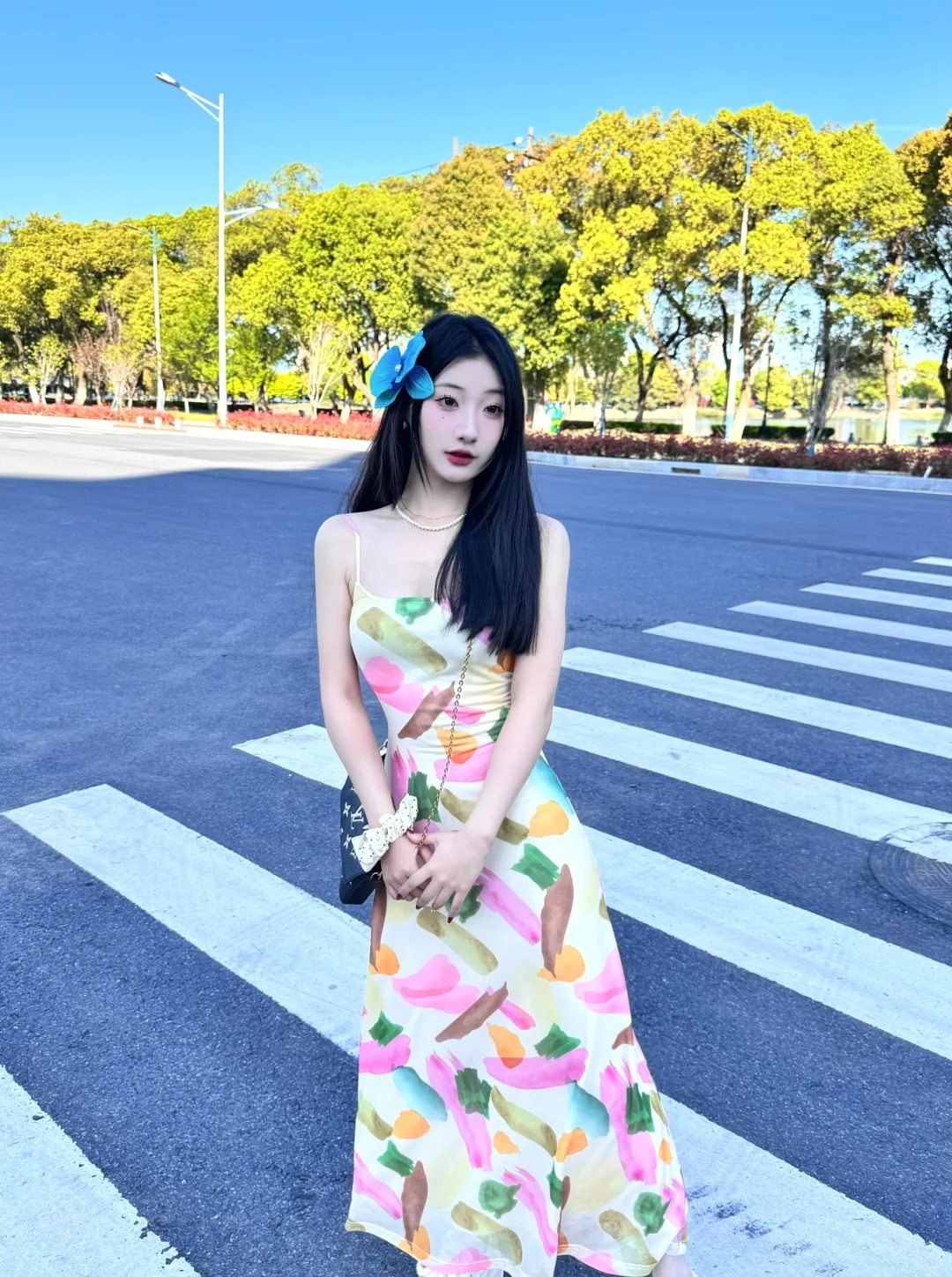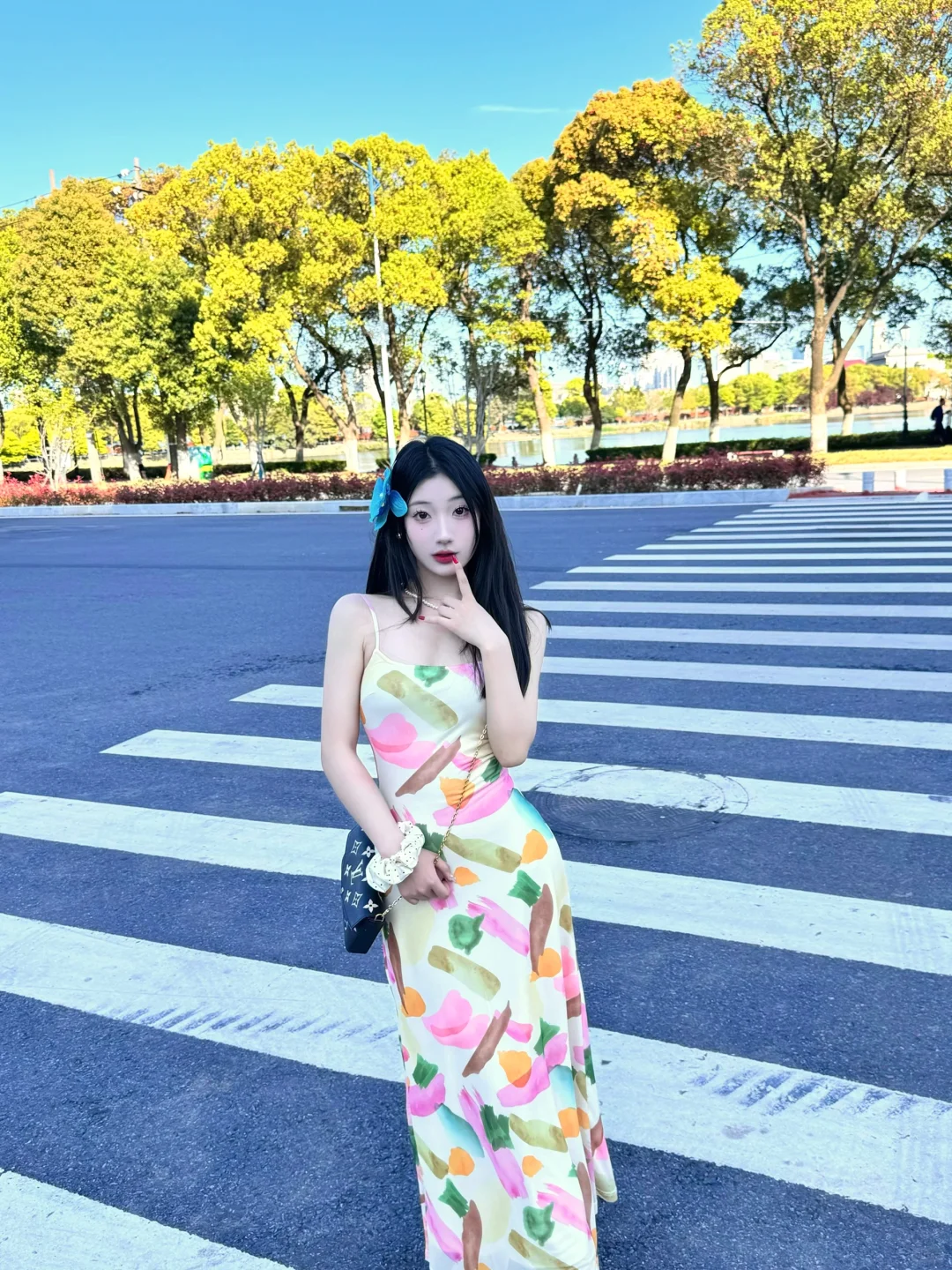 是南昌东湖意库旁边的湖哈哈哈 花花吊带长裙好显身材啊 配蝴蝶兰发夹 好纯欲好春天啊啊啊啊