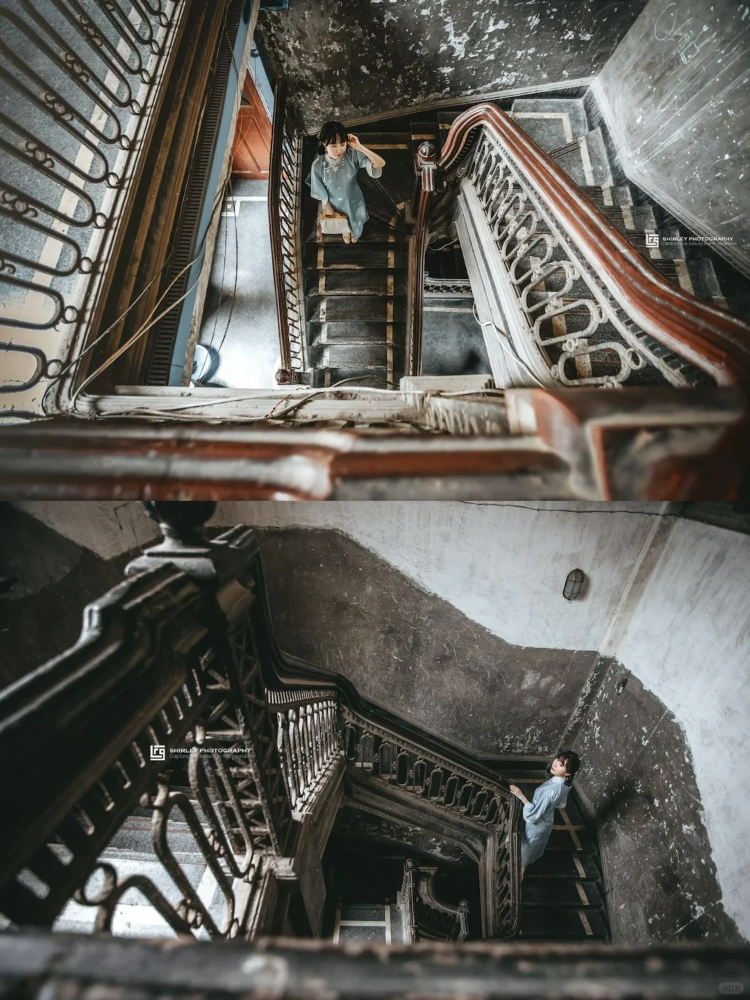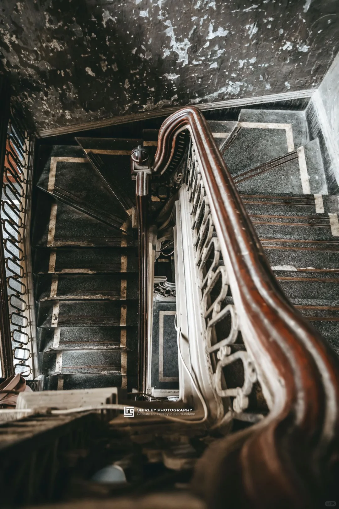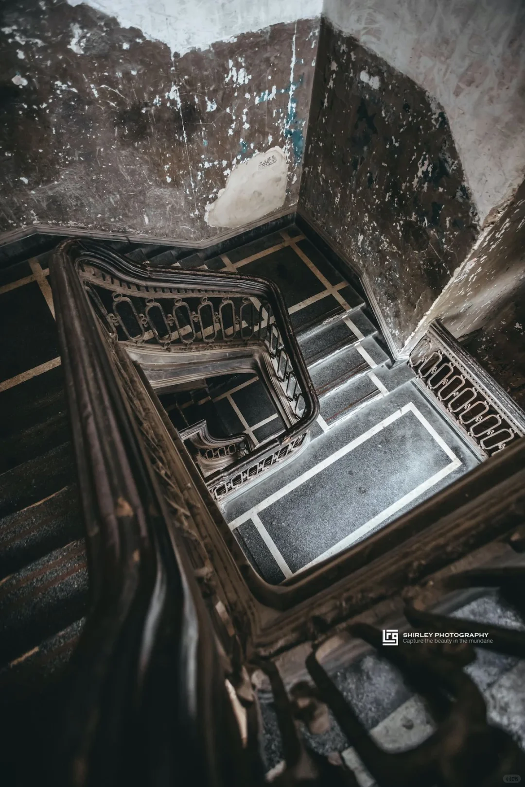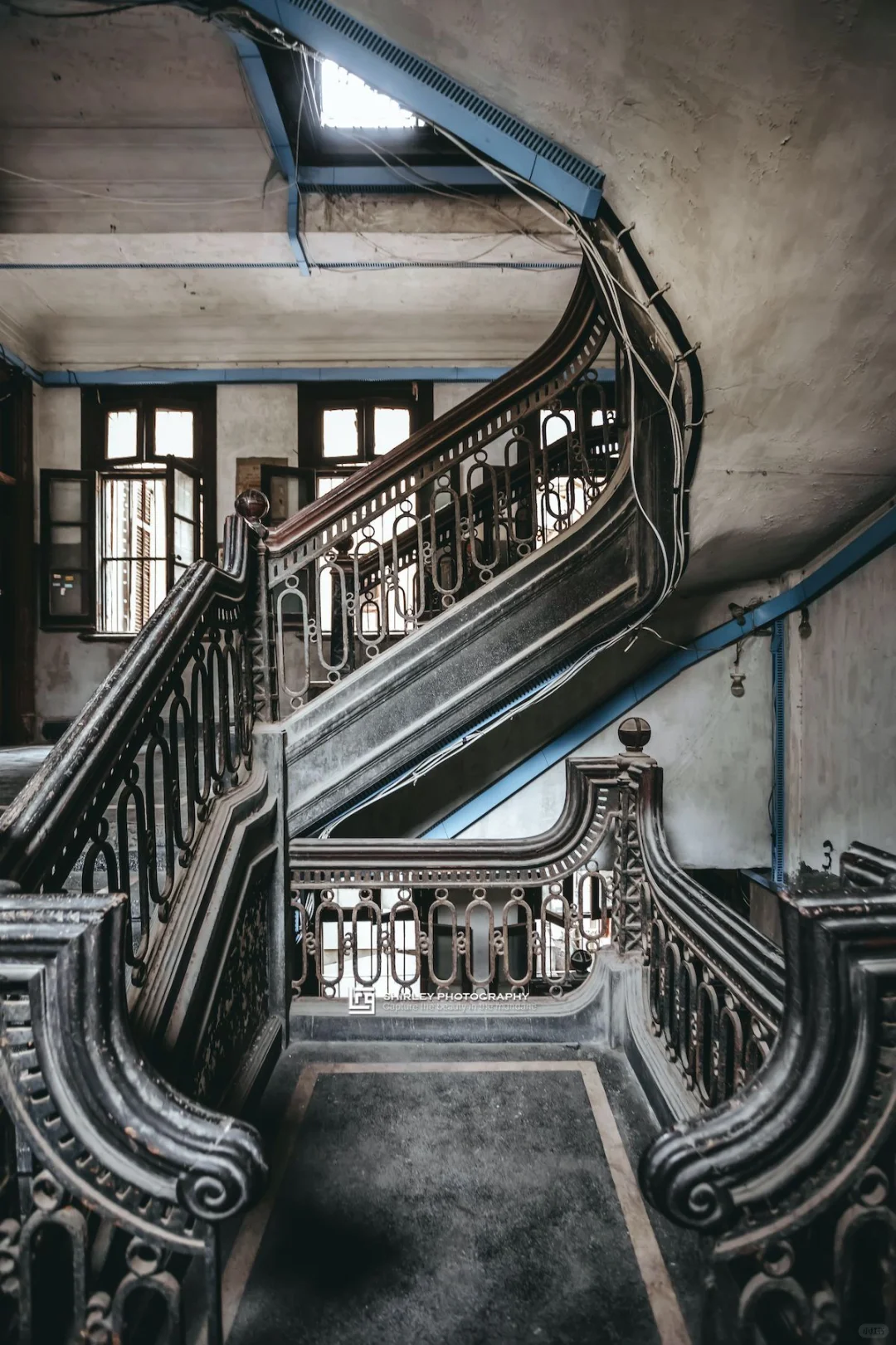 ▫️抛开眼前的斑驳与沧桑,依然不难发现这座建筑典雅华贵的底色。精致繁复的铁艺雕花楼梯盘旋而上,无论仰视俯视都在空间里划出了优美流畅的线条。大量圆角、圆窗、老式百叶窗、水磨石地砖的设计运用,仍然诉说着那个风华绰约的年代。