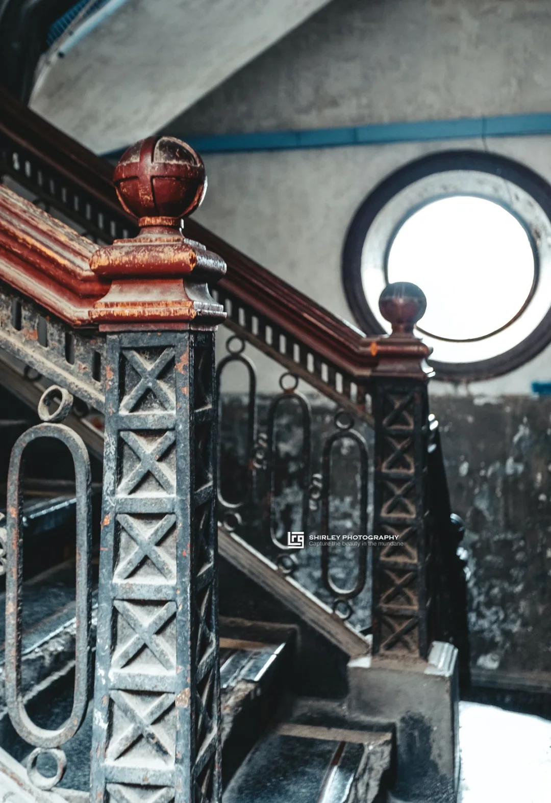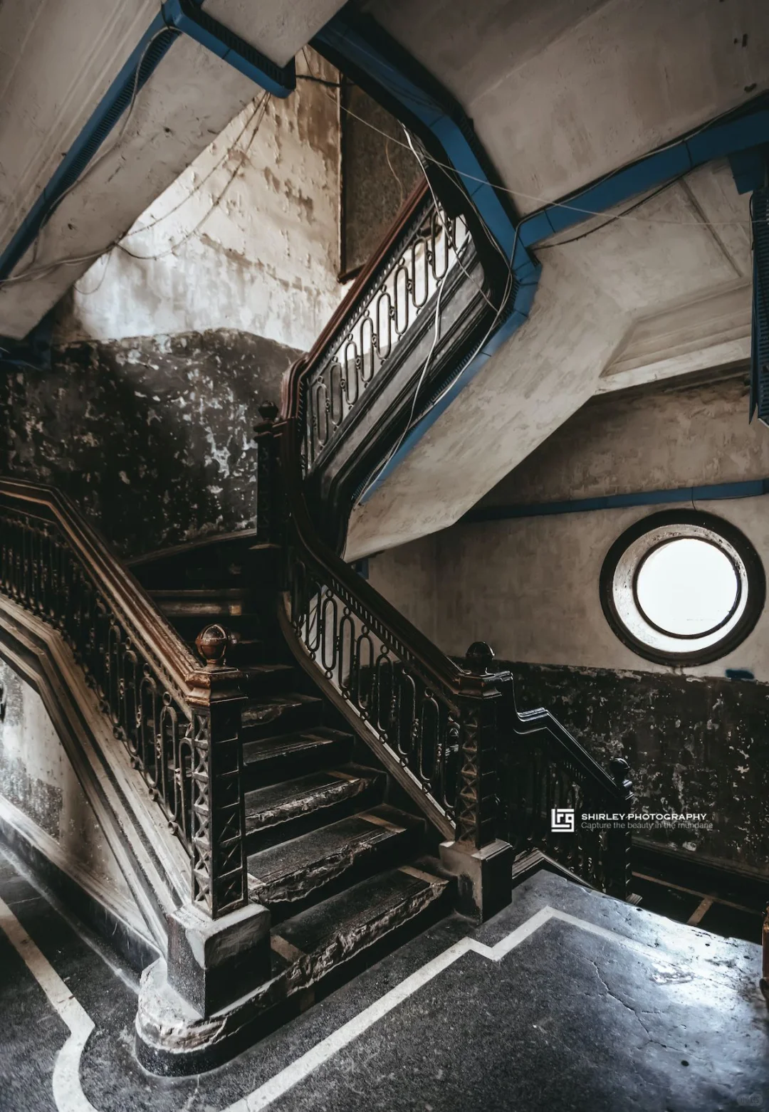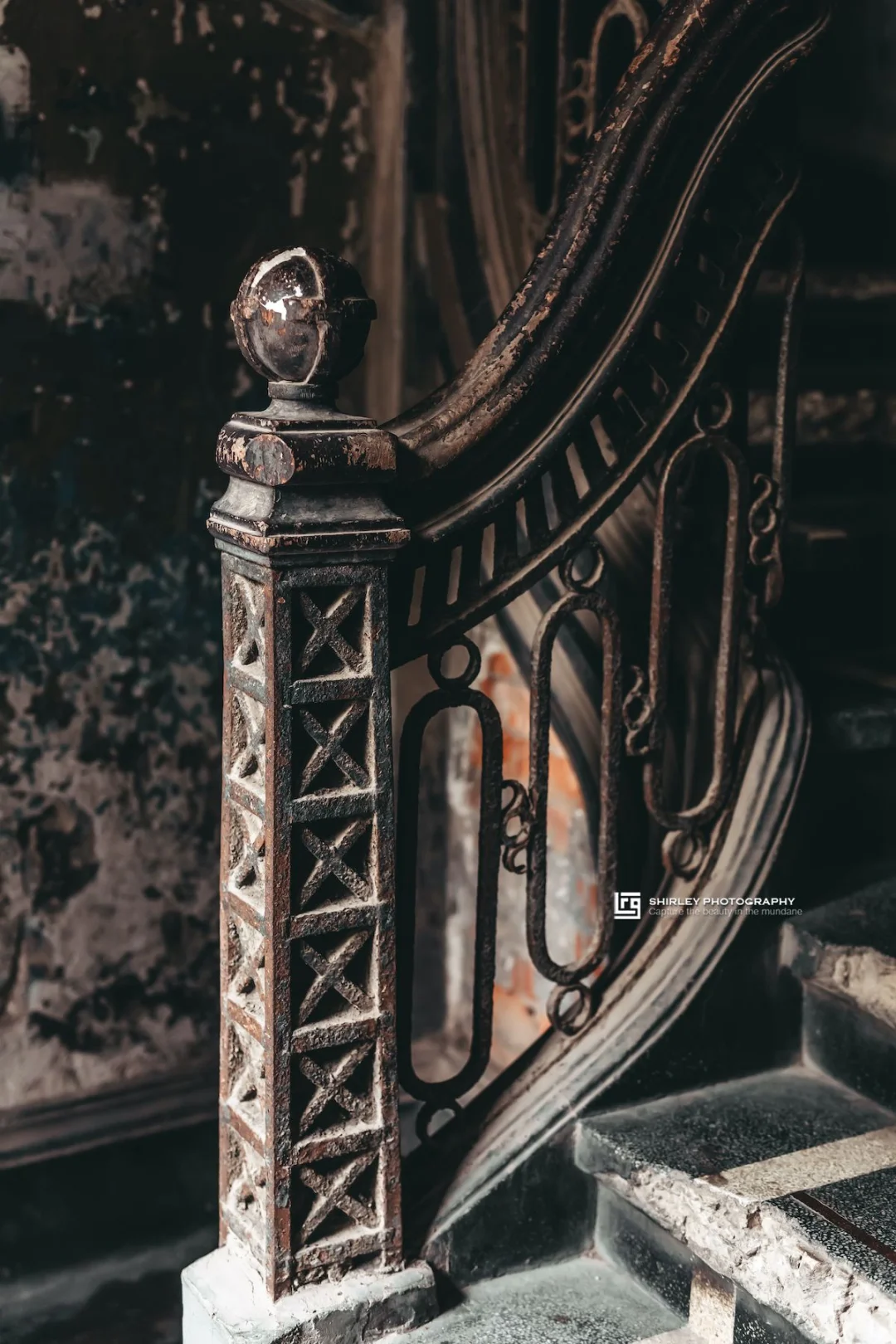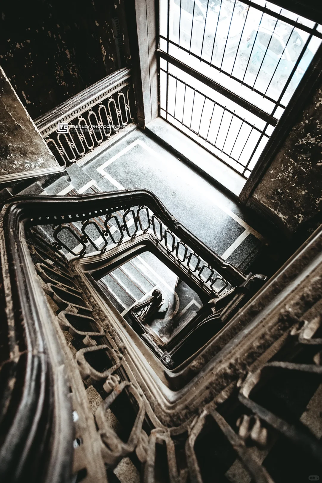 ▫️抛开眼前的斑驳与沧桑,依然不难发现这座建筑典雅华贵的底色。精致繁复的铁艺雕花楼梯盘旋而上,无论仰视俯视都在空间里划出了优美流畅的线条。大量圆角、圆窗、老式百叶窗、水磨石地砖的设计运用,仍然诉说着那个风华绰约的年代。