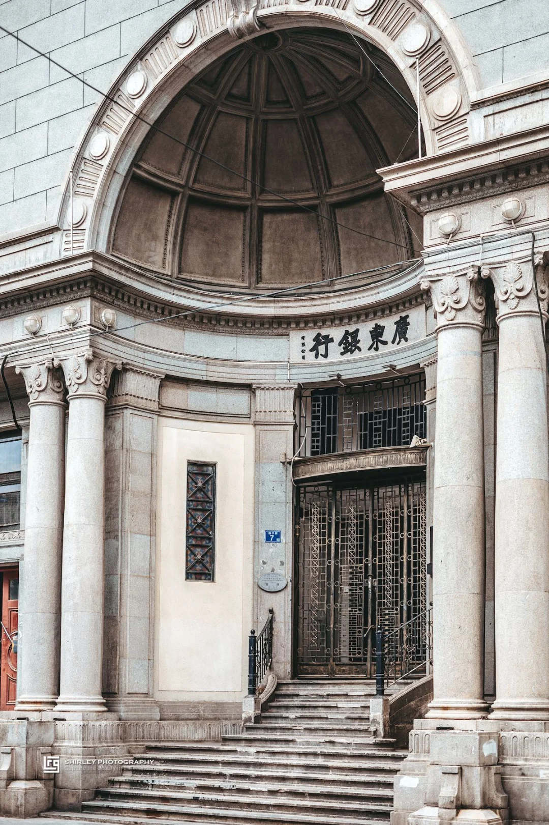 外观最具记忆点的部分就是建筑立面构图采用仿帕拉第奥母题式手法,中部凹进形成半圆形入口,在汉口老建筑中极为少见。上方覆盖敞开式半穹窿顶,仰拍气势磅礴。“the bank canton Ltd”几个英文单词还留存着,字体怀旧感十足。