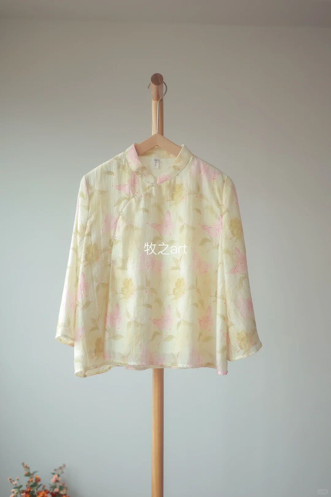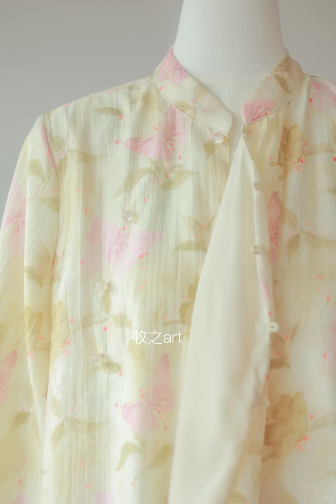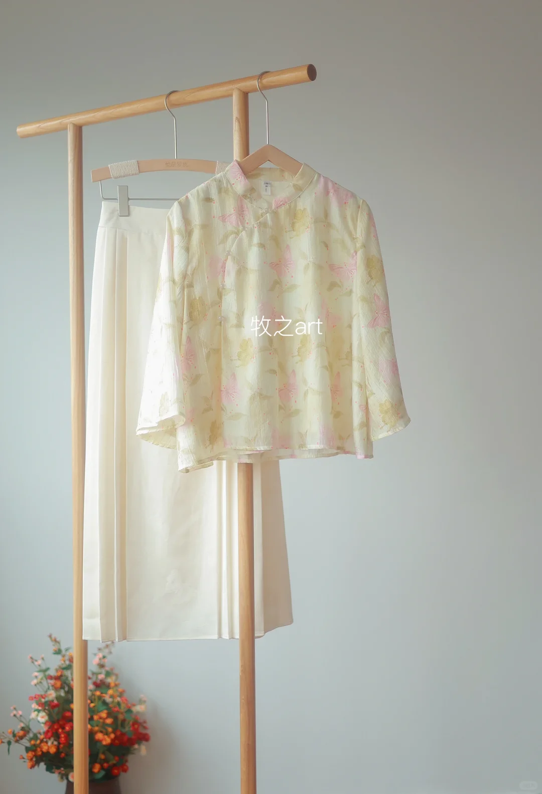 偏米色底调,加蝴蝶印花,春意盎然的颜色 心情都会变好~ 小立领,更显精致,也会日常些 倒大袖袖口仙仙的~ 3️⃣码,双层有米色内衬 半裙:黛语蝶 -