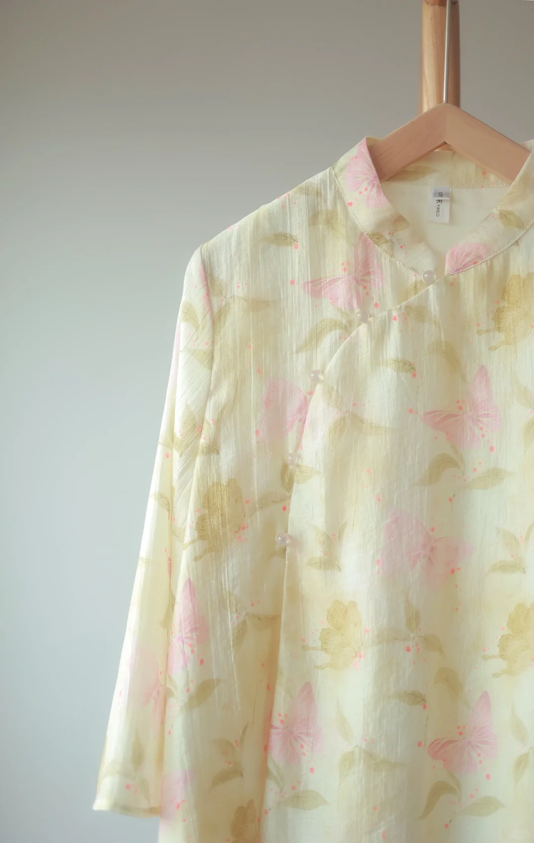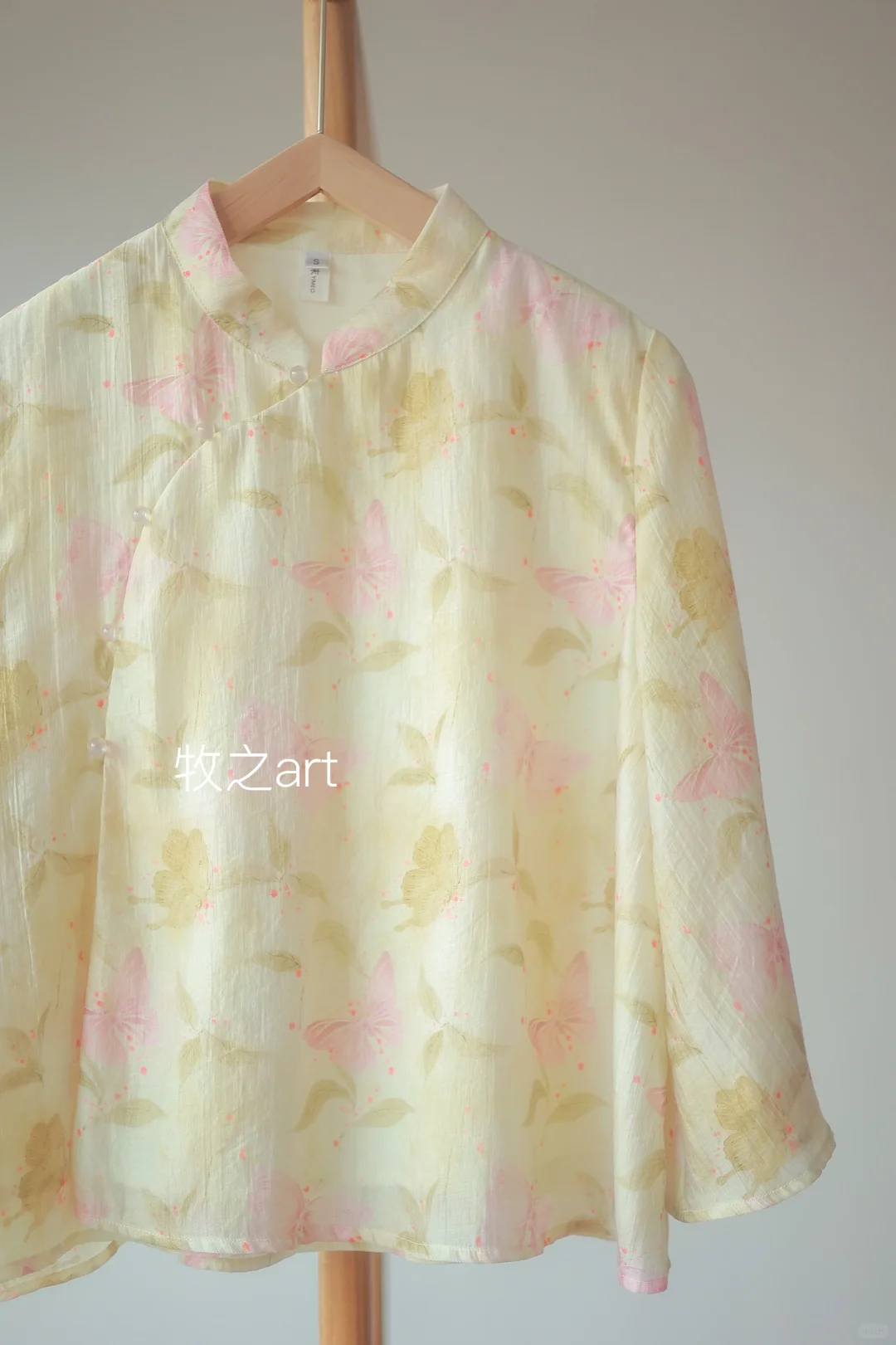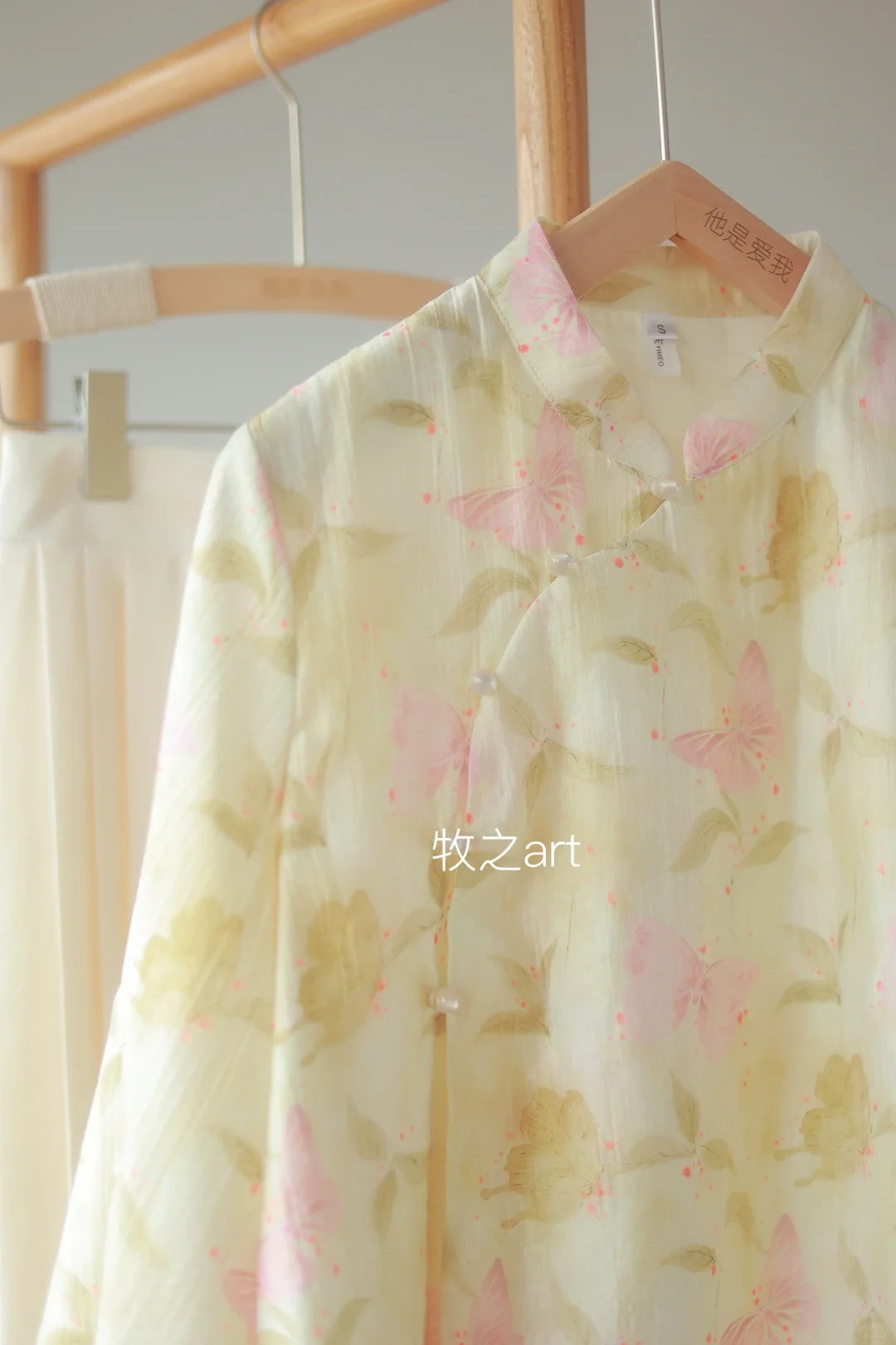 偏米色底调,加蝴蝶印花,春意盎然的颜色 心情都会变好~ 小立领,更显精致,也会日常些 倒大袖袖口仙仙的~ 3️⃣码,双层有米色内衬 半裙:黛语蝶 -