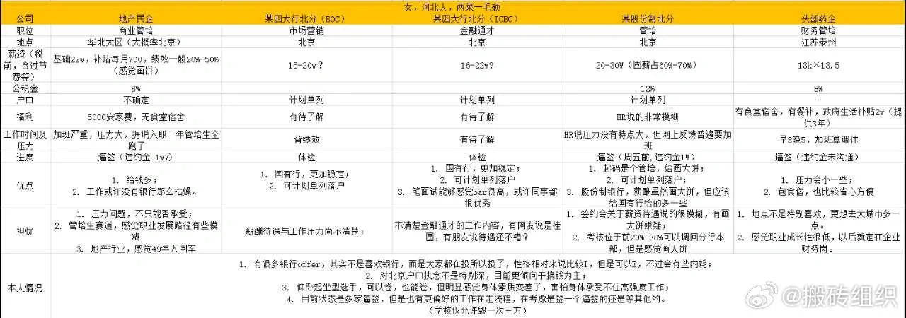 2⃣几个银行类offer待遇可以,有户口是优势,搞钱应该还是股份行大于四大行,boc应该待遇是最弱的,想要搞钱还是去股份行,那家管培看起来还有机会回去,应该是最优选了;[赞R][赞R]