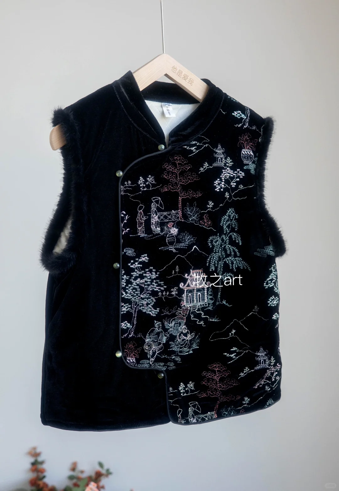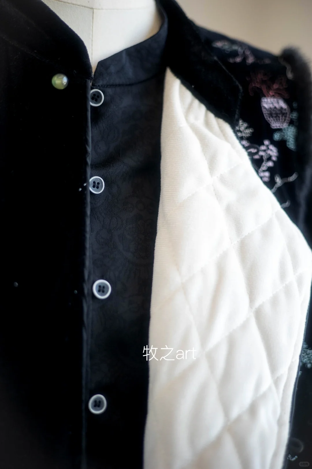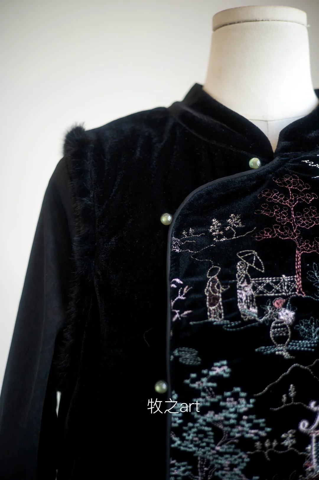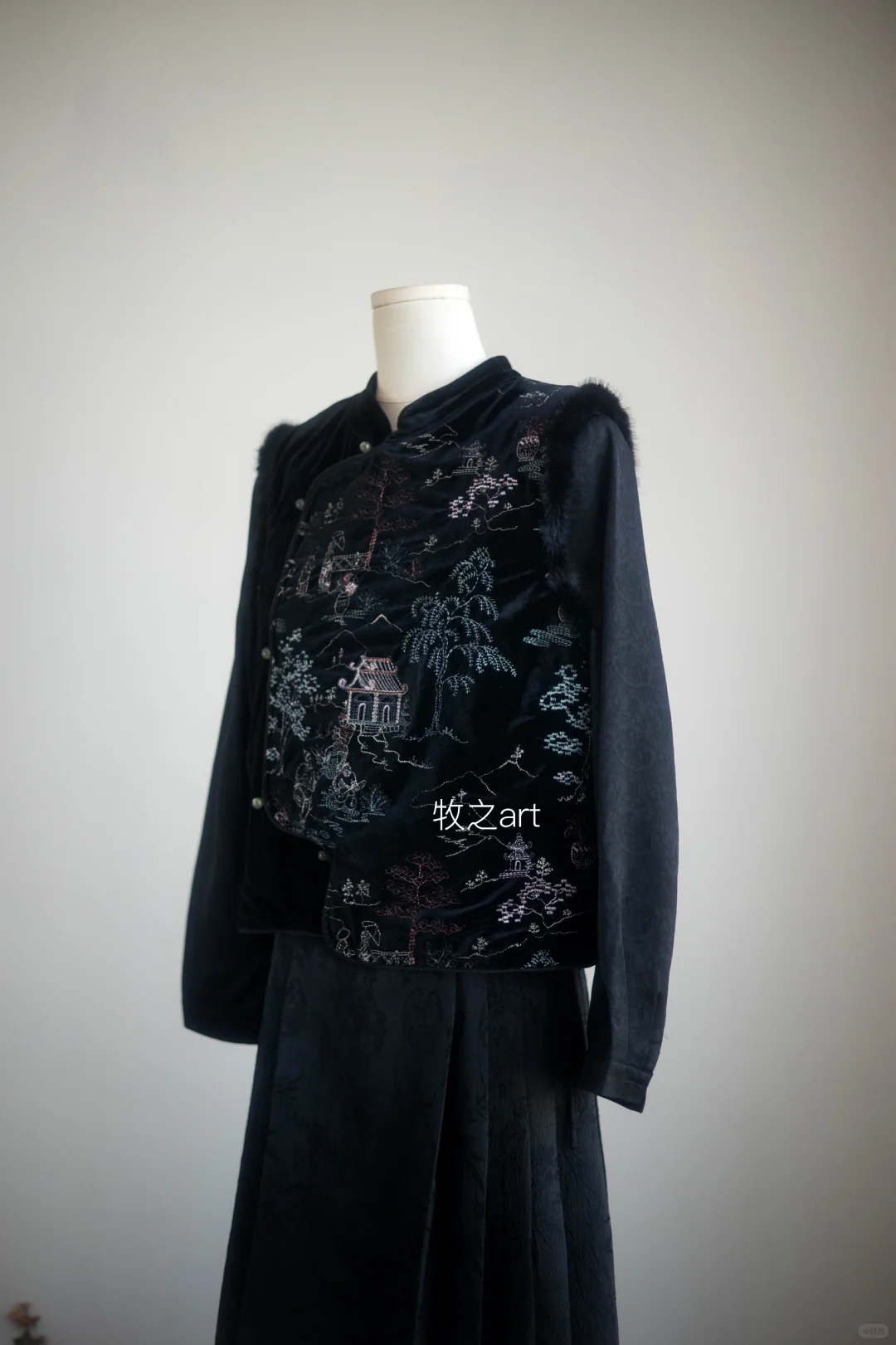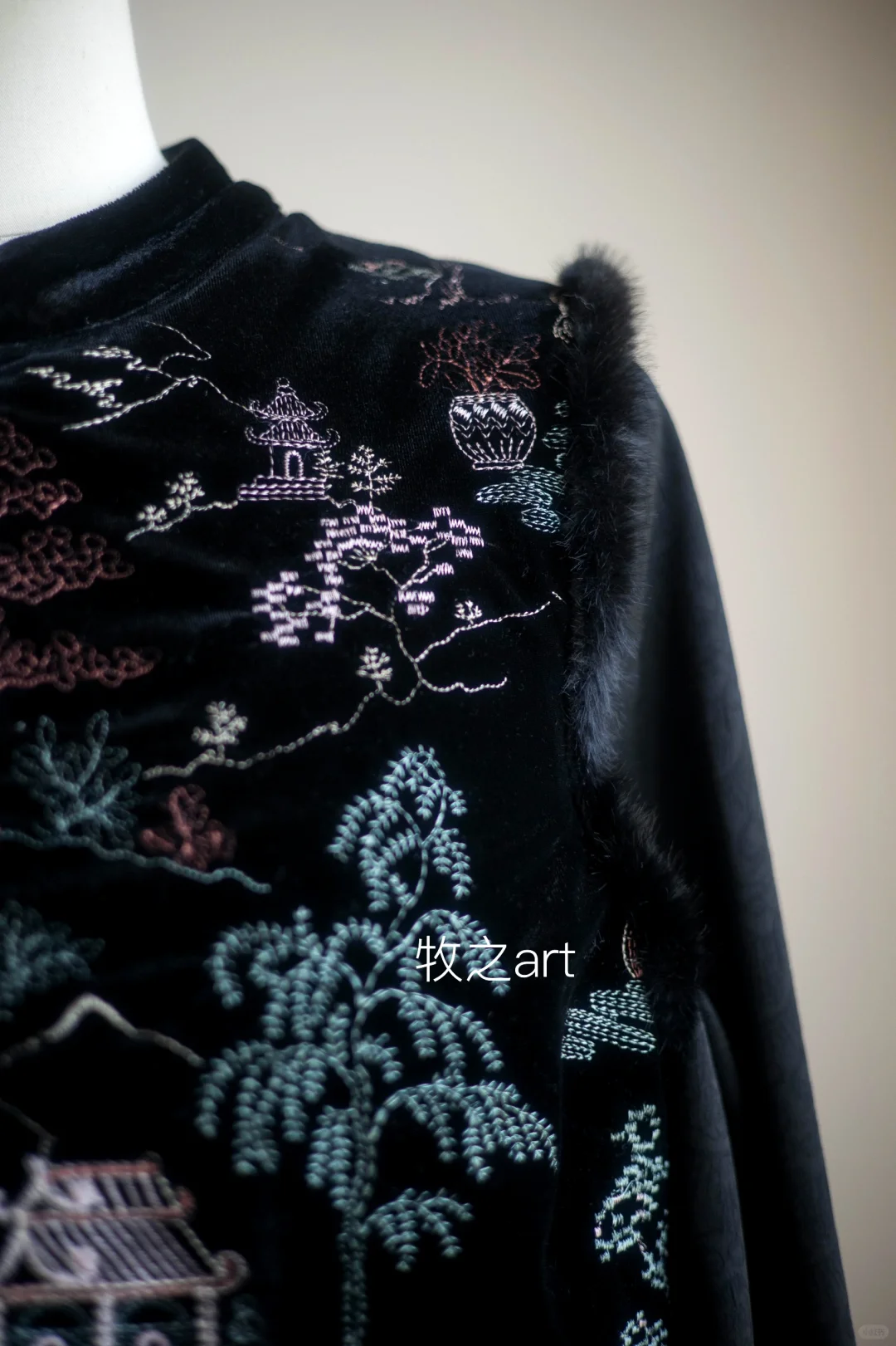 江亭山色同款刺绣,做在了丝绒面料上,更大气了些 黑色丝绒面料真的好贵气,独特的光泽感 三码,版型是宽松的,特别藏肉肉 非常感恩越来越多的人开始喜欢新中式,追求新中式穿搭风格。 -