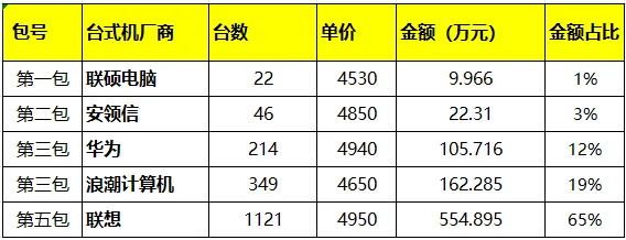 安领信今年在台式机市场也开始发力,以4850元的单品价格中标46台;另外一家中标厂商是联硕电脑,此次中标金额较小,为9.966万元。安领信和联硕电脑作为区域性信创品牌成功中标,显示出央采渠道对创新型中小企业的开放态度,为市场注入活力。