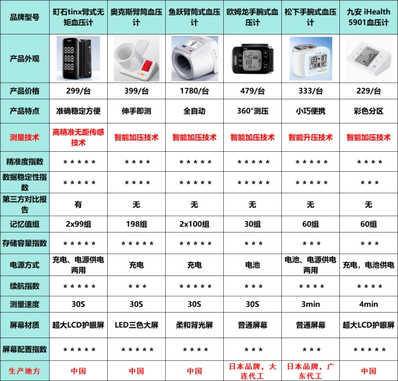 选购血压计前,难免需要做一些功课。查看各款产品的基础数据,能帮助大家做出更加明智的决策。这张表格列出了本次测评的几款血压计的详细参数,大家可以通过这些数据清楚地看到它们的优势与差异,找到最适合自己的那一款。