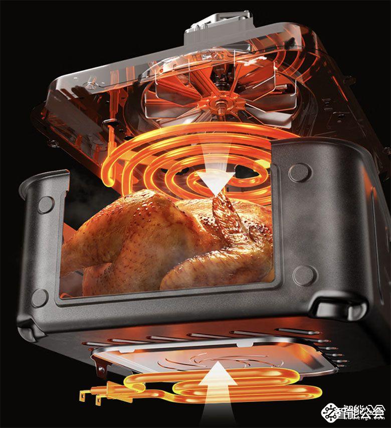 单靠高温还不够,均匀受热才是美味的关键。V589采用上下发热管配合螺旋扇叶,形成涡流式强劲热流,搭配11叶涡轮扇,大幅提升空气循环效率。热风在腔体内高速旋转,全方位包裹食材,确保每一面都能均匀受热。独特的立体架空烘烤结构,减少热风阻力,让热流环流效果更佳,真正做到无需翻面,也能实现四面金黄、外酥里嫩的理想口感。
