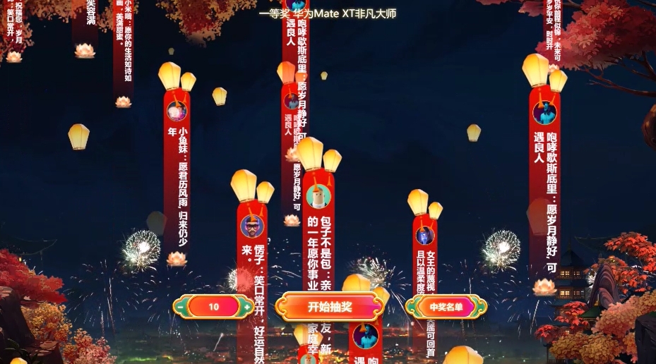 签到发送祝福语,开始抽奖后之前,大屏幕上天灯的效果展示。按“开始抽奖”或按空格键后开始抽奖,天灯放飞速度越来越快,再次按空格结束抽奖后,中奖的祝福语会在大屏幕上一次排列开,并出现中奖名单