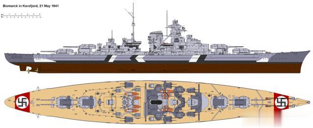 另外,这也是俾斯麦号在与胡德号战列巡洋舰交战时的外观状态。