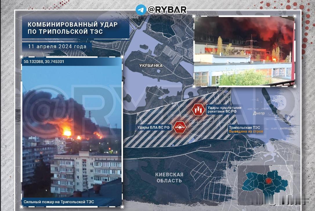 “炸!炸!炸!”乌克兰最大的火力发电厂,基辅地区的特里皮尔利亚火电厂损失惨重。4月11日,俄军对乌克兰特里皮尔利亚电厂实施了轰炸,轰炸点燃火力发电厂的燃料库,引发了殉爆,导致这个乌克兰火力发电厂的发电机,变压器,整个工厂厂房和大楼,全部发生了爆炸,被大火覆盖。该热电厂负责供应基辅州大约57%的电力需求。这座发电站是基辅、切尔卡瑟和日托米尔三个州的主要电力来源。基本可以确认,乌克兰特里皮尔利亚电厂被彻底销毁了。乌克兰特里皮尔利亚电厂除了是乌克兰最大的火力发电厂,还是乌克兰能源电力系统调配的中心之一。估计俄军下一轮打击目标,是如何有效的切断乌克兰核电站,而不导致核电站发生事故和泄露。在4月11日,俄军出动了18架图-95MS战略轰炸机,8架米格-31K战斗机,发射了20枚以上的空射巡航导弹(可能更多),8枚匕首高超音速导弹,40架以上的伊朗小摩托,沙赫德-136自杀式无人机。从俄军轰炸乌克兰电厂来看,对敌人就像秋风扫落叶一样残酷无情,这是在打仗,是你死我活的战争,不是请客吃饭。对于乌克兰能源系统的轰炸,俄罗斯国防部表示:“作为对基辅政权企图对俄罗斯油气行业和能源设施造成破坏的回应,俄罗斯武装力量动用高精度远程空基和海基武器发动了大规模打击,还用无人机袭击乌克兰燃料和能源设施。”基辅、哈尔科夫、利沃夫、敖德萨、罗夫诺、切尔卡瑟等地都迎来了俄罗斯空天军的轰炸,乌克兰重要的发电设施被重点关照,电网负荷雪上加霜。随着基辅地区最大火电厂被摧毁后,俄军下一个目标,基辅和卡涅夫水电站。如果再把核电掐断,乌克兰全境基本无力维持电力需求了。