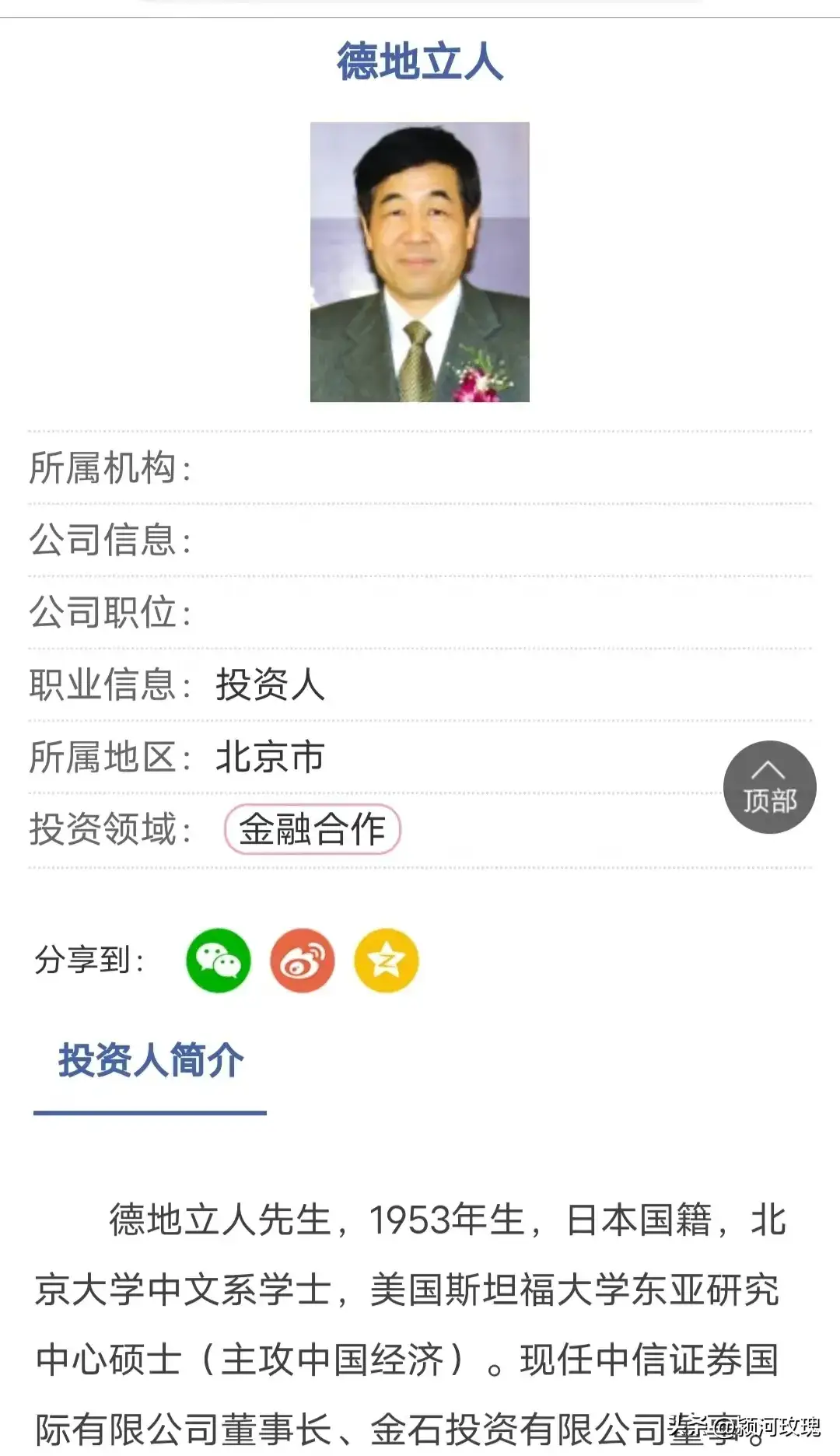 百度百科显示,中信证券董事长德地立人是日本大和族,毕业于北大文学系,这是什么情况?有知道的吗?