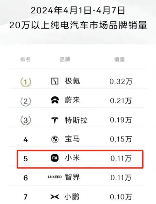 小米SU7的4月份第一周销量出炉了,是1000多台,助力小米成为整个20万以上的纯电汽车市场的品牌前五名,超过智界和小鹏汽车了,你们怎么看呢?