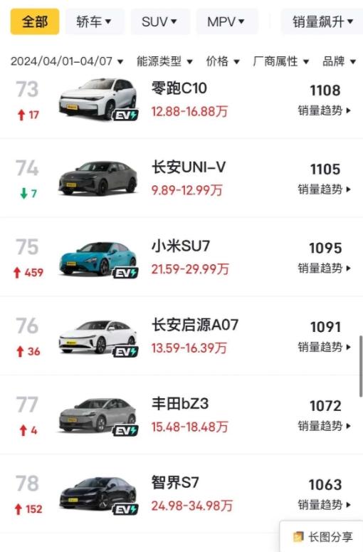 小米SU7的4月份第一周销量出炉了,是1000多台,助力小米成为整个20万以上的