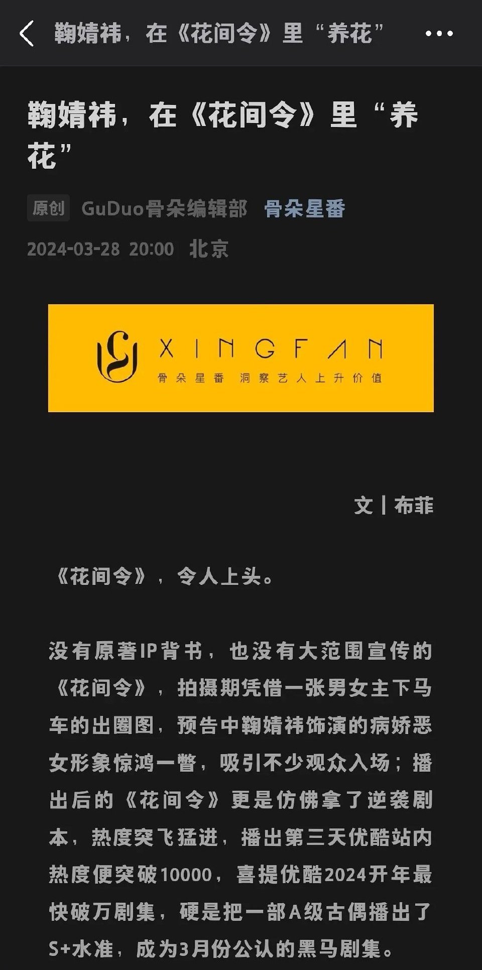 鞠婧祎《花间令》 业内评价来咯[羞嗒嗒]多方认可,火火的很安心[给你小心心]