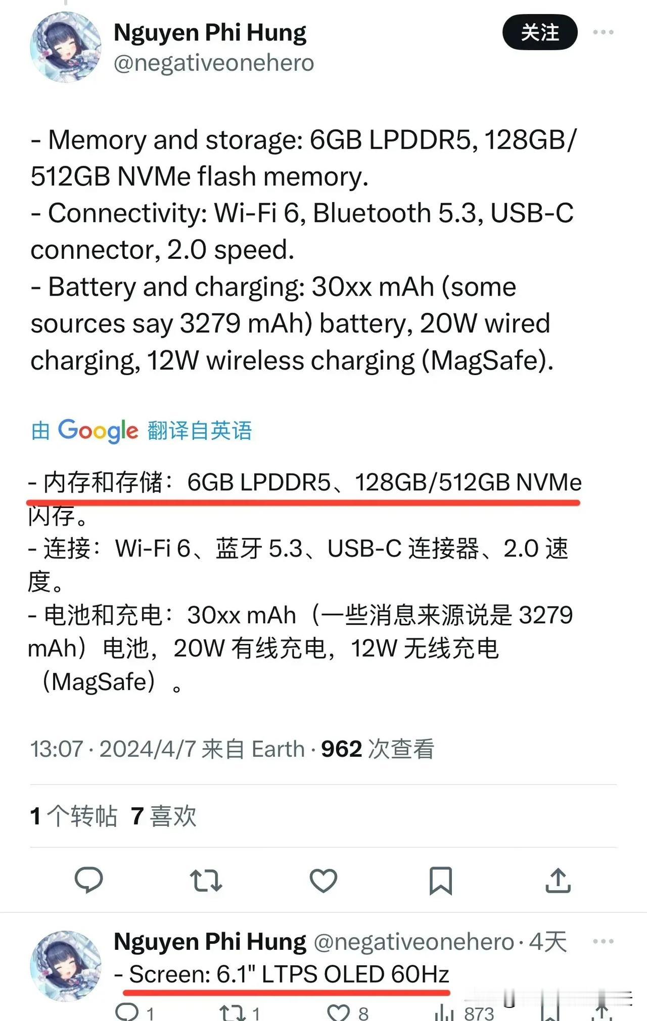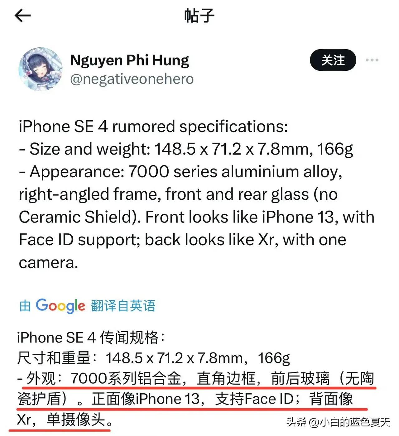 【#iPhoneSE4规格曝光#】外媒把主要配置都曝了,iPhone SE 4采用6.1英寸OLED屏幕,只支持60Hz刷新率,边框用的是7000系列铝合金,背部1200万索尼IMX503单摄,搭载苹果A16处理器,正面像iPhone13背面像iPhone XR,支持Face ID,6 + 128GB起步,机身厚7.8mm、重166g。